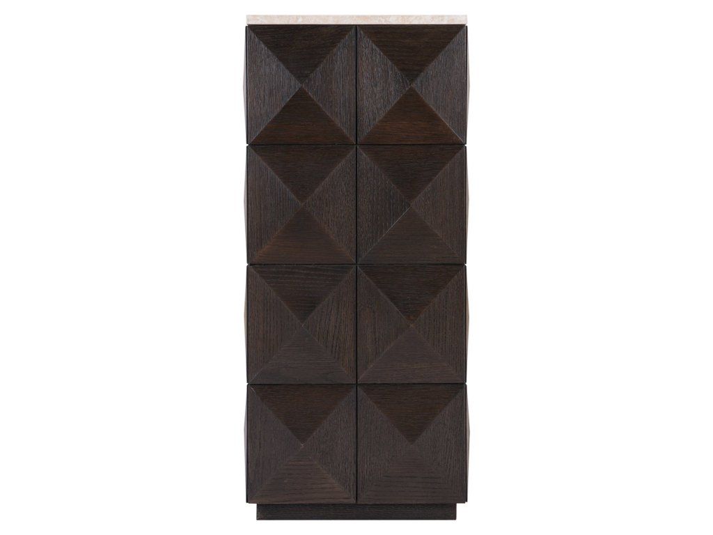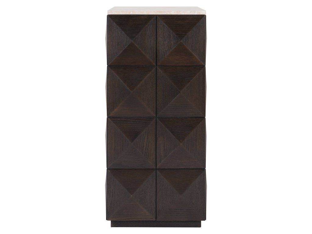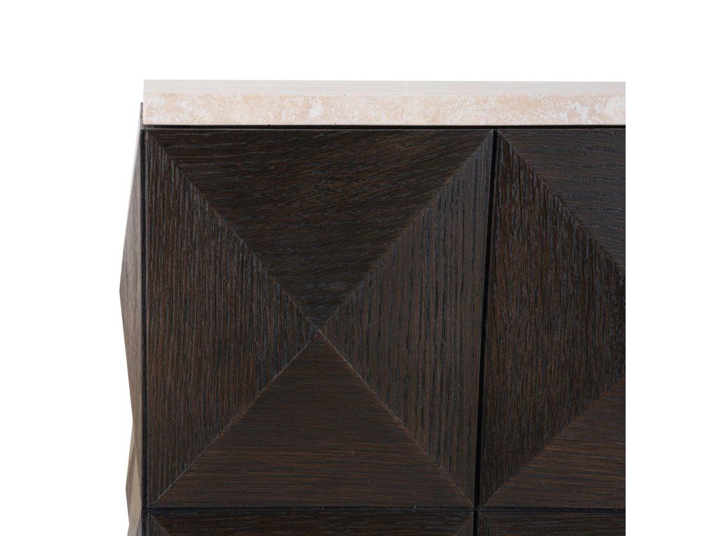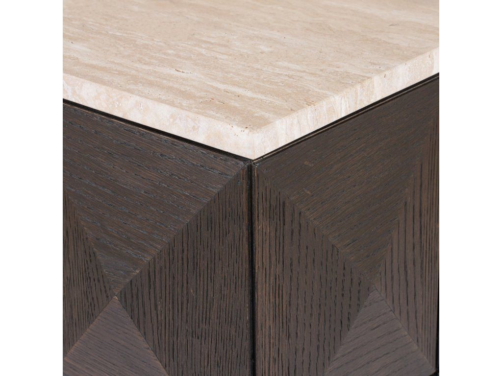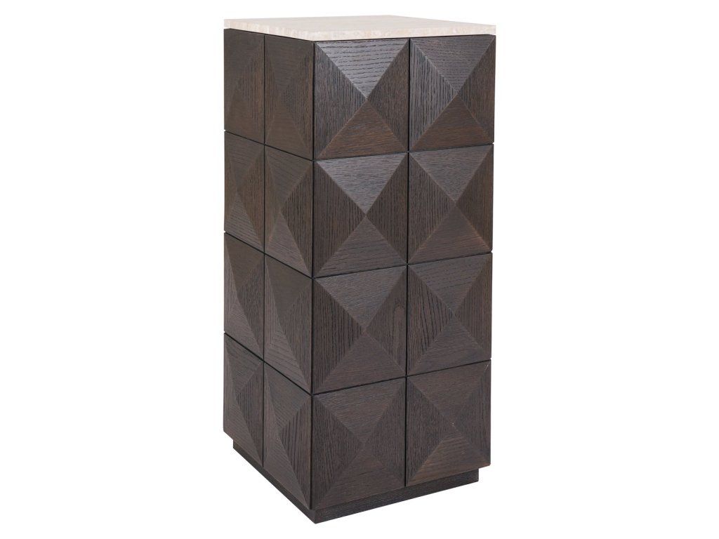 Stĺp Claremont je vyrobený z dubovej dyhy, dubového dreva, travertínu a dreva, čo mu dodáva robustný a elegantný vzhľad. Podstavec sa vyznačuje výrazným geometrickým vzorom na bokoch, ktorý mu dodáva moderný a štýlový nádych. Kamenná doska poskytuje odolný a luxusný povrch, ideálny na vystavenie dekoratívnych predmetov. Tento podstavec je funkčný aj dekoratívny a bezproblémovo sa hodí do rôznych štýlov interiéru.Dodatočné parametre