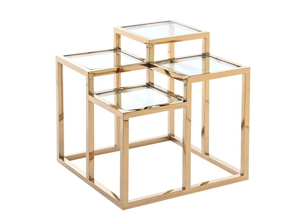 Príručný stolík Malibu kombinuje krásu a funkčnosť. Kľúčové sú jeho pútavý dizajn, vynikajúca povrchová úprava a dôraz na detail. Jeho elegantný dizajn sa dobre hodí k minimalistickému štýlu, vďaka čomu sa perfektne hodí do každého interiéru. Rovnako ako iný nábytok z kolekcie L.A. Glam, dopĺňa glamour, moderný, loftový, minimalistický a newyorský štýl interiérov a so správnou kombináciou môže zdobiť aj obývačky v industriálnom štýle. Príručný stolík Malibu s rozmermi 60x60x60 cm sa skladá z niekoľkých prvkov, ktoré vytvárajú podmanivý tvar a formu. Má štyri malé dosky stola umiestnené na geometrickom podstavci. Dosky stola sú vyrobené z priehľadného skla, zatiaľ čo podstavec je vyrobený z nehrdzavejúcej ocele v krásnej zlatej farbe. Vďaka tomu je stolík Malibu dostatočne všestranný na to, aby sa dal kombinovať s iným nábytkom, a najlepšie vyzerá v kombinácii s plyšovým nábytkom čalúneným zamatom. Spoločne vytvárajú perfektný kútik na relaxáciu a zábavu hostí. Na štyri dosky stola sa zmestí malé občerstvenie a nápoje, ako aj decentné dekorácie, ako napríklad váza s kvetmi.Dodatočné parametre