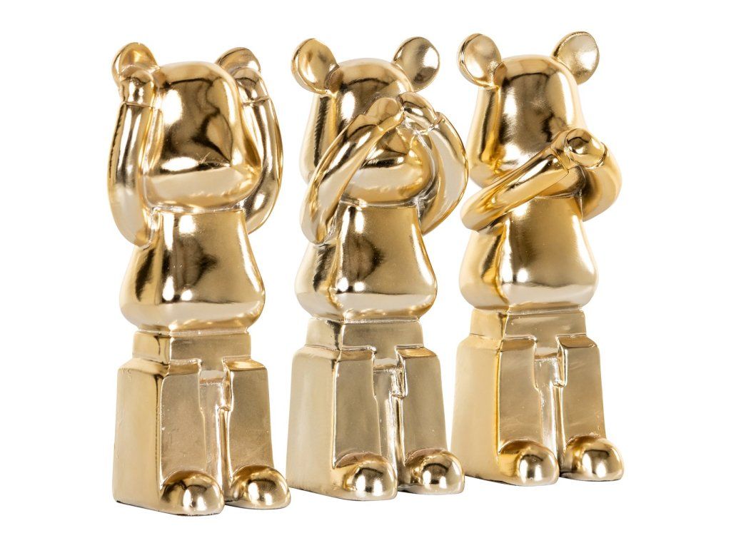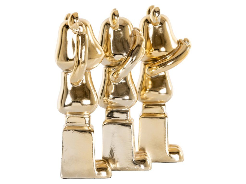 Sada 3 figúrok Berna je elegantná a symbolická sada troch dekoratívnych figúrok, z ktorých každá má jedinečnú a ikonickú pózu. Tieto figúrky, vyhotovené v lesklom zlate, ponúkajú hravú interpretáciu slávnych prísloví „nepočujem zlo, nevidím zlo, nehovorím zlo“. Každá figúrka predstavuje jedno z troch múdrych výrokov: jedna zakrýva uši, druhá oči a posledná ústa. Táto krásna sada nielenže dodáva každému priestoru nádych luxusu vďaka lesklej zlatej povrchovej úprave, ale poskytuje aj hlbší význam, ktorý môže byť zaujímavým začiatkom konverzácie. Sada Berna je ideálna na spoločné vystavenie na poličke, skrinke alebo konferenčnom stolíku.Dodatočné parametre