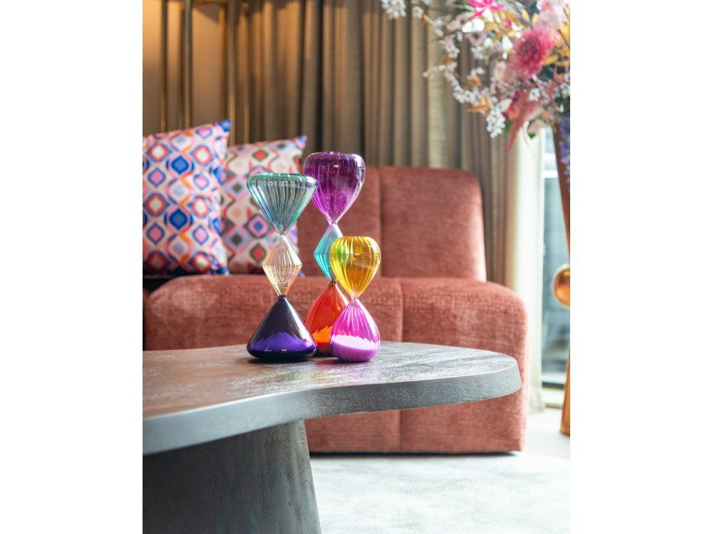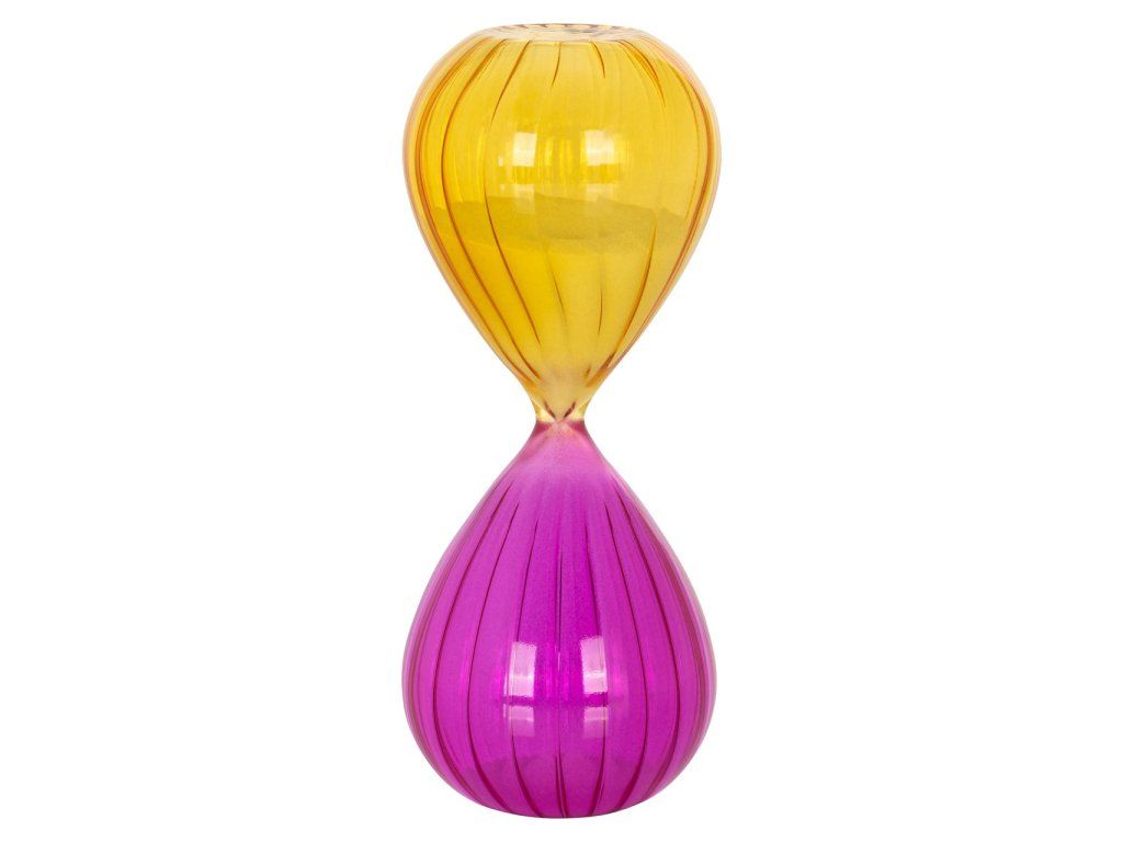 Presýpacie hodiny Jahla majú sklenenú konštrukciu s odtieňmi fialovej a žltej. Piesok vo vnútri je neutrálny, zatiaľ čo farebné sklo jemne zobrazuje plynúci čas. Je to decentný, no esteticky príjemný predmet, vhodný do rôznych interiérov.Dodatočné parametre