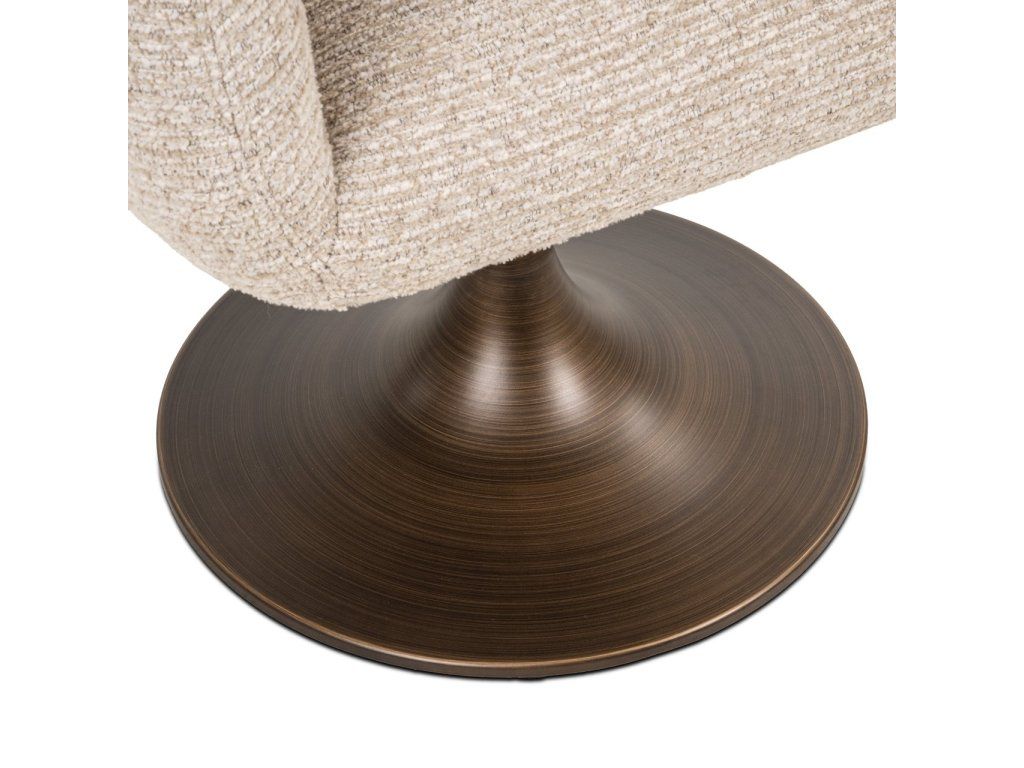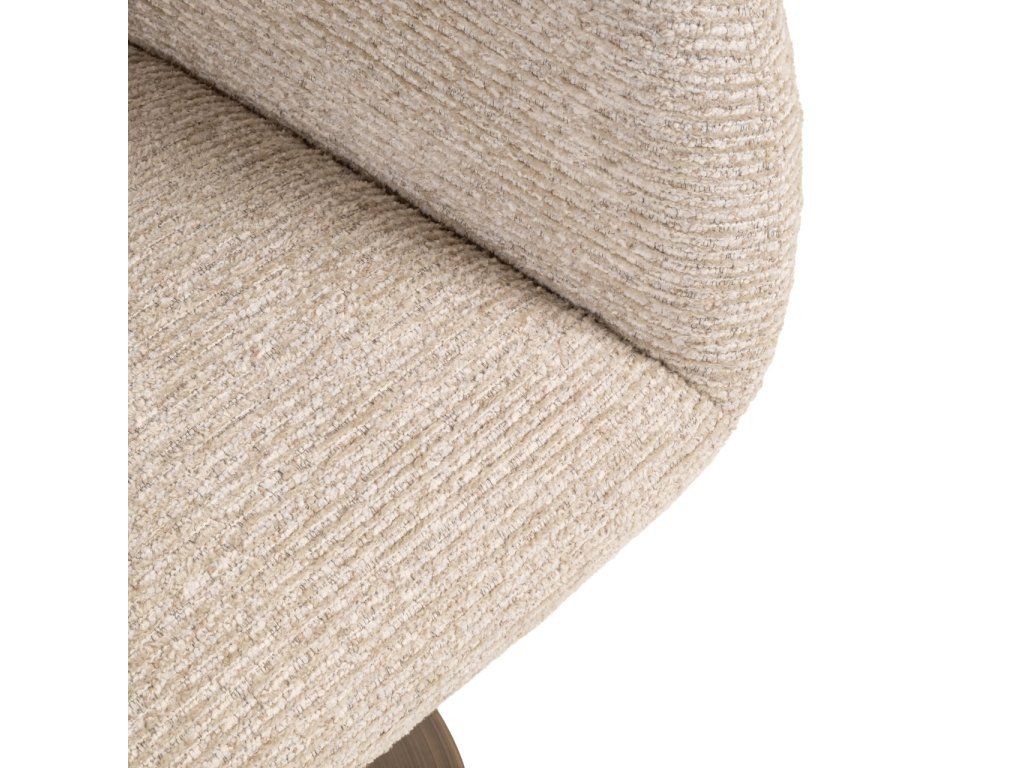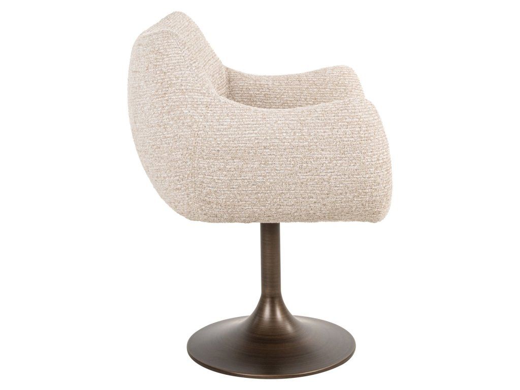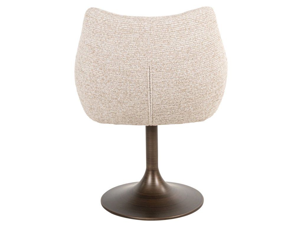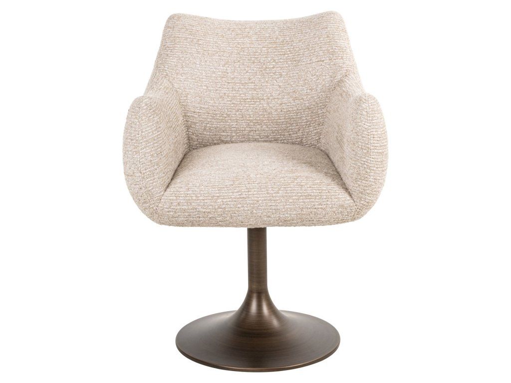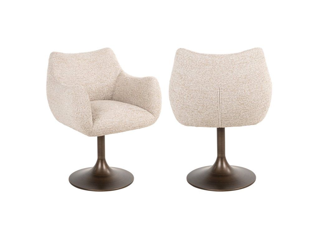 Táto elegantná otočná stolička kombinuje moderný dizajn s teplým, mäkkým čalúnením, ktoré vás okamžite pozýva k usadeniu. Organicky tvarované sedadlo ponúka dokonalú oporu pre chrbát a ruky, zatiaľ čo jemná textúra látky dodáva luxusný vzhľad. Vďaka pevnej kovovej základni s nadčasovou bronzovou povrchovou úpravou je stolička nielen stabilná, ale dodá každému interiéru aj elegantný nádych. Či už ju použijete pri jedálenskom stole, v obývačke alebo ako výrazný kus nábytku v útulnom kútiku, táto stolička vyžaruje kvalitu a pohodlie.Dodatočné parametre