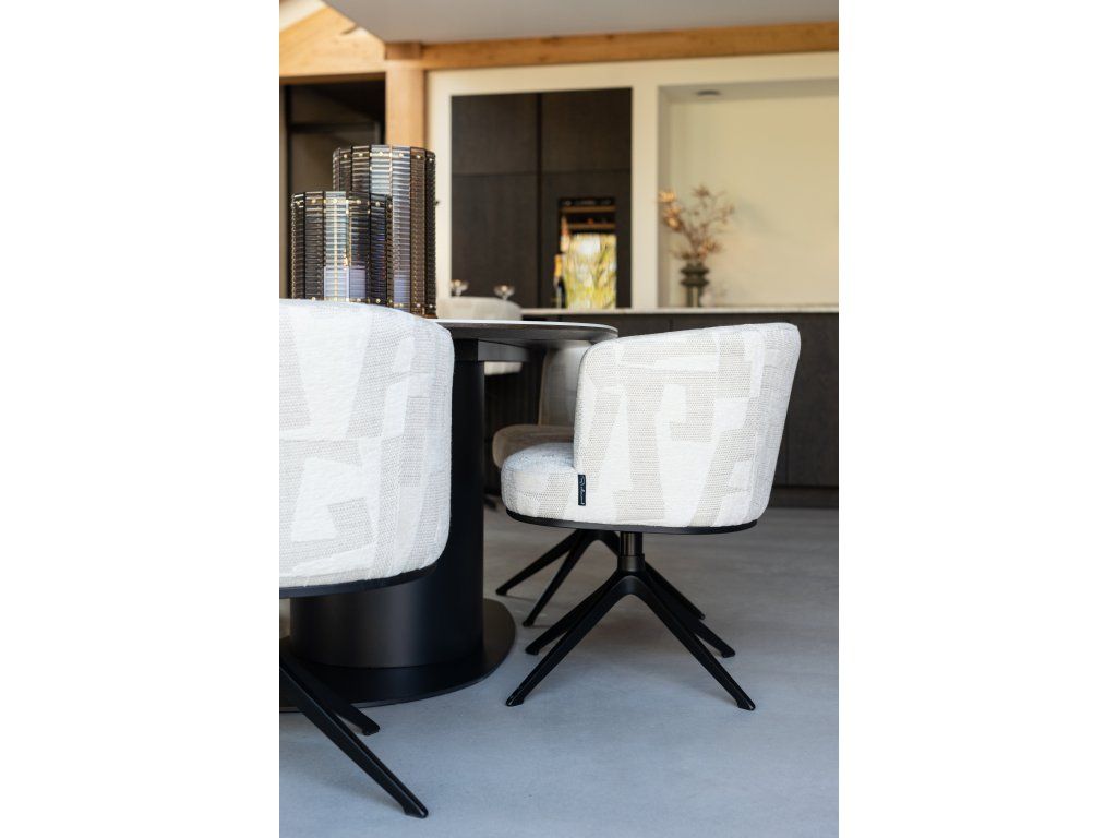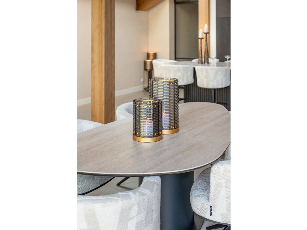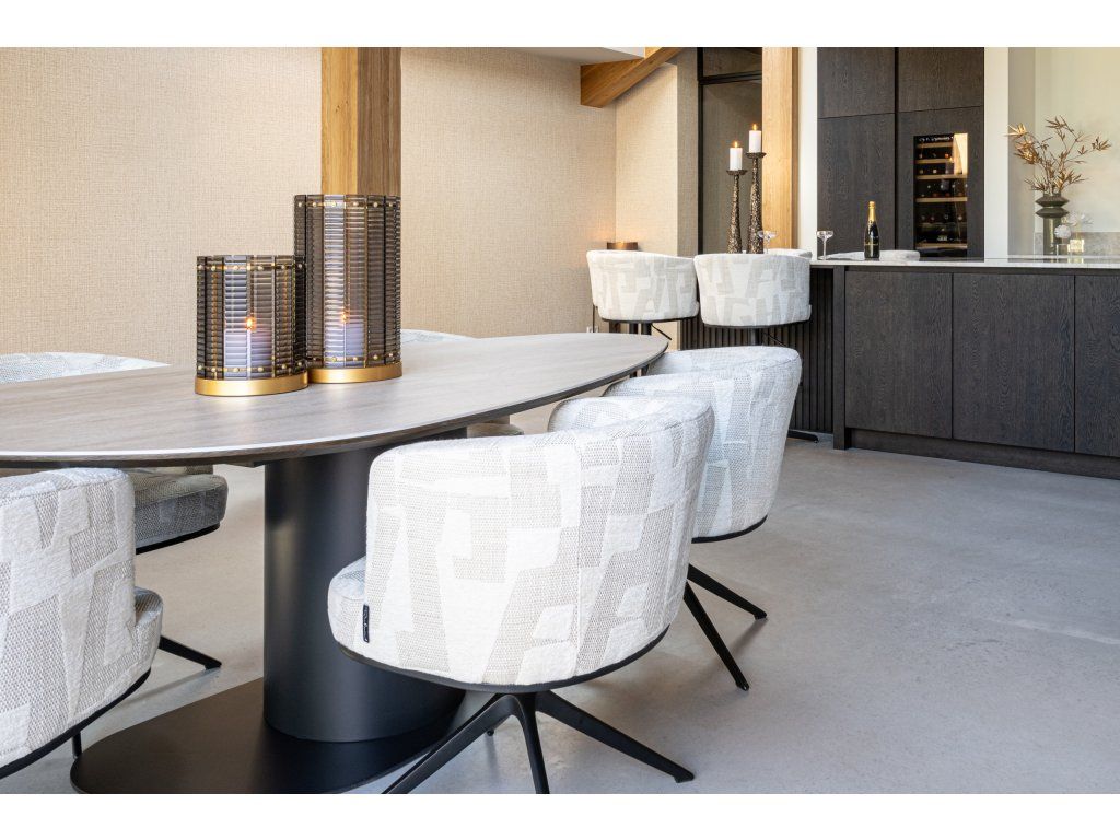 Jedálenský stôl Ritz Pebble je rafinovaný a moderný stôl vyrobený z MDF, kovu a keramiky. Keramická doska stola vyžaruje luxus a prírodnú krásu vďaka jedinečnej textúre travertínovej dosky a jemným farebným variáciám. Pevná konštrukcia MDF zaisťuje odolnosť, zatiaľ čo kovová základňa zaisťuje solídny a moderný vzhľad. Organický kamienkový tvar dosky stola dodáva stolu hravý a zároveň elegantný vzhľad, vďaka čomu je ideálnou voľbou pre štýlovú jedáleň.Dodatočné parametre