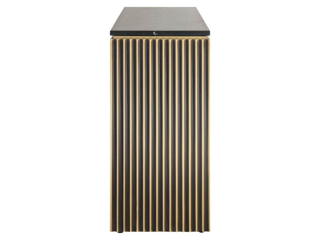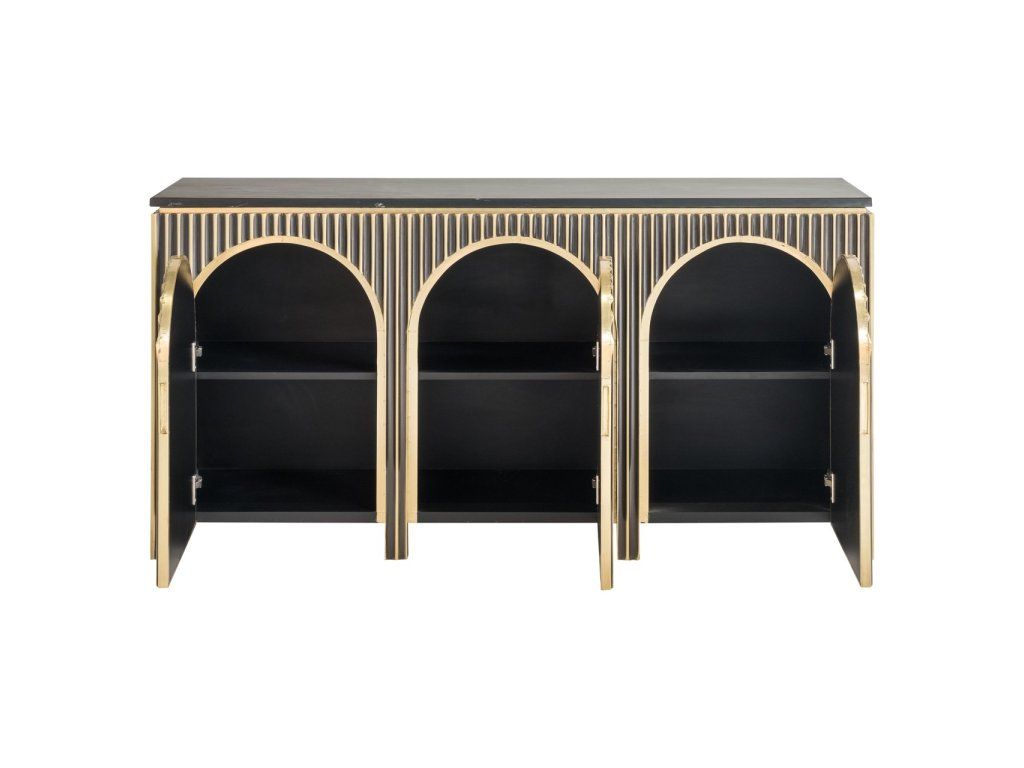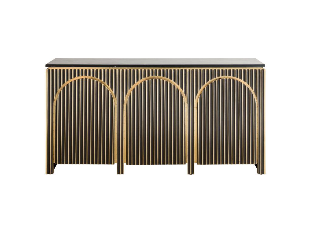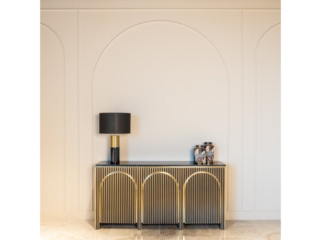 Táto príborník z kolekcie Les Arcs je vyrobený z MDF s mosadzným obkladom a vrchnou doskou z tmavého mramoru. Dizajn s tromi dvierkami má pokojný vzhľad vďaka jednoduchým líniám a kombinácii materiálov. Oblúky na prednej strane dodávajú jemný klasický nádych, zatiaľ čo použité materiály zabezpečujú pevný a funkčný kus, ktorý sa hodí do rôznych interiérov.Dodatočné parametre