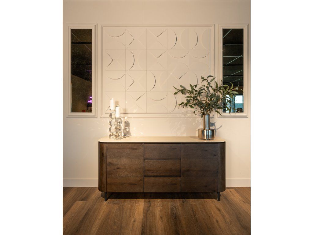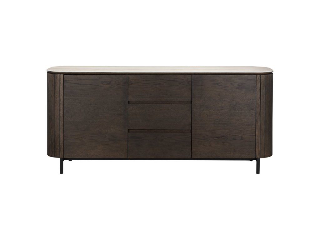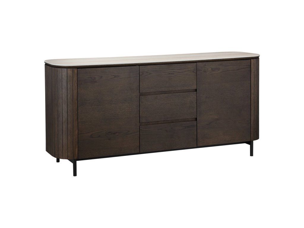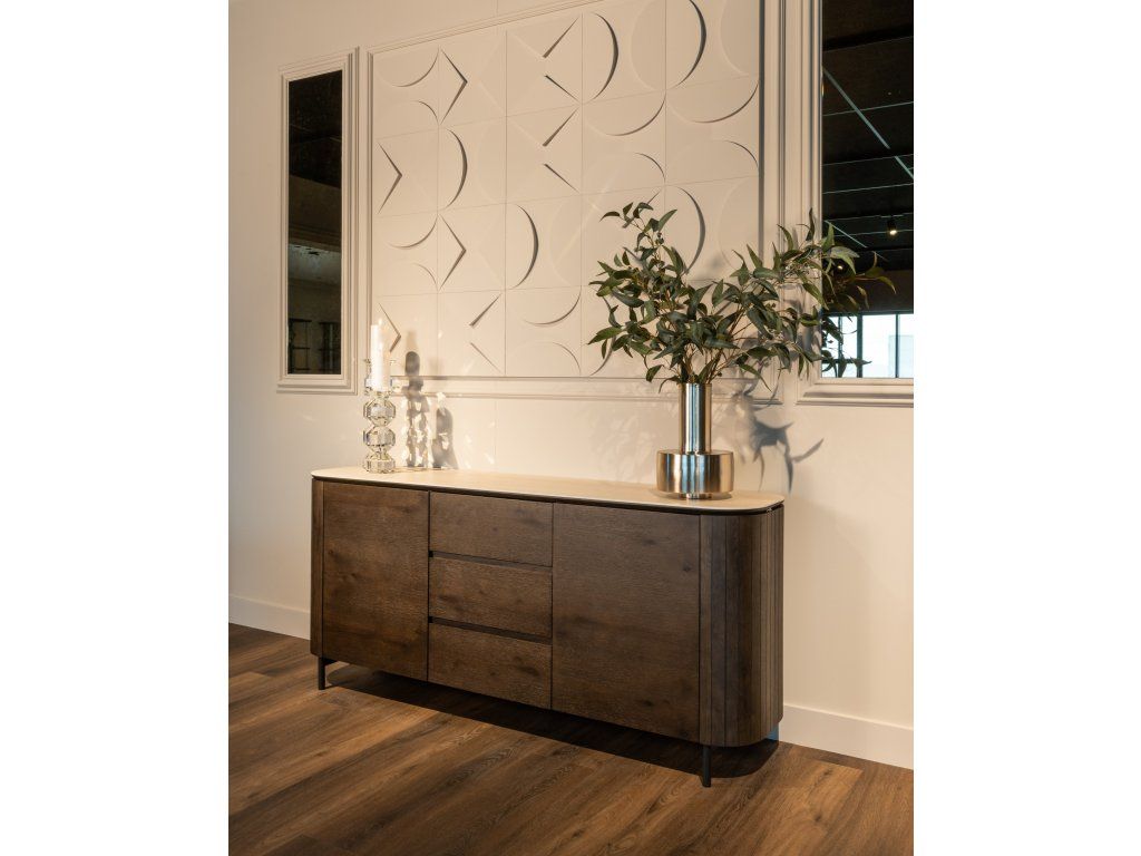 Komoda Ritz kombinuje moderný dizajn s prírodnými materiálmi vyrobenými z dubovej dyhy, keramiky, MDF a recyklovaného dreva. Tento štýlový kus nábytku ponúka dostatok úložného priestoru s dvoma dvierkami a tromi zásuvkami, čo zaisťuje praktickú organizáciu. Keramická doska dodáva luxusný vzhľad pripomínajúci travertín, zatiaľ čo dubová dyha prináša teplo a eleganciu. Kombinácia vysoko kvalitných materiálov a elegantného dizajnu robí z tejto komodity rafinovaný a funkčný doplnok do každého interiéru.Dodatočné parametre