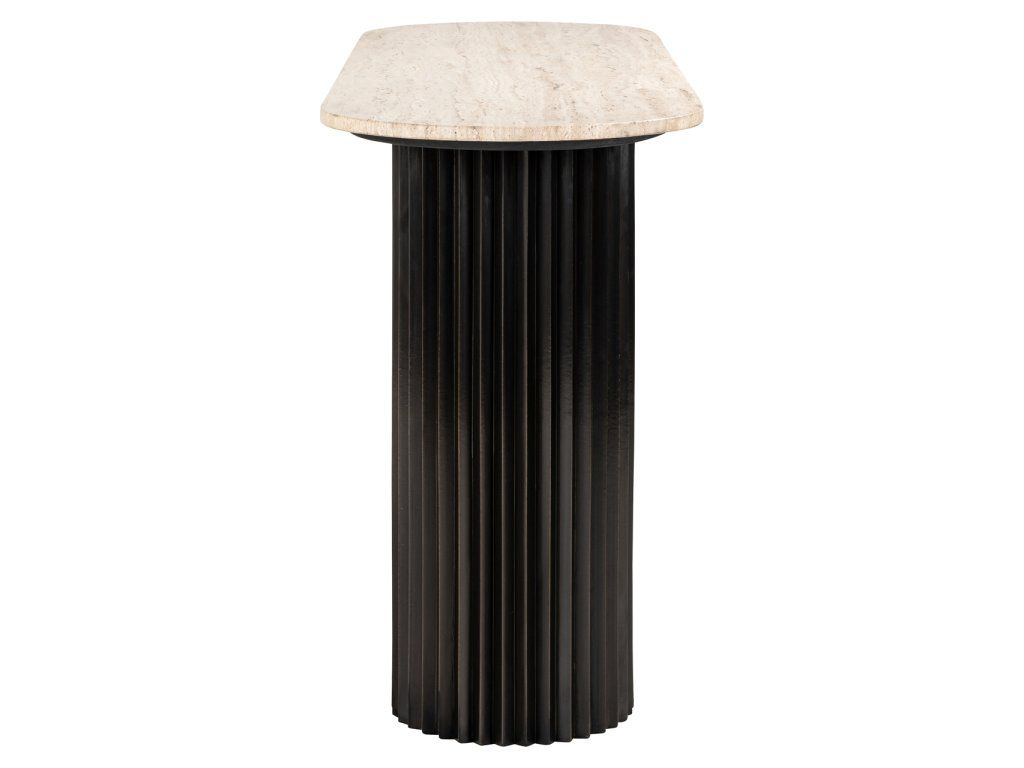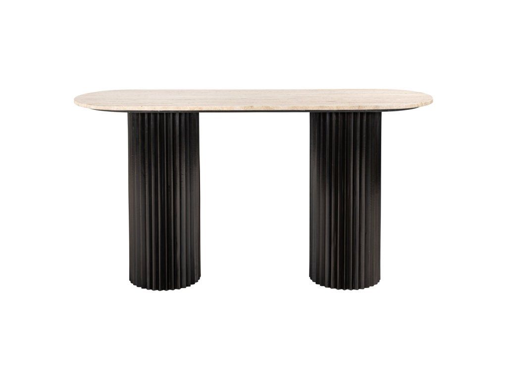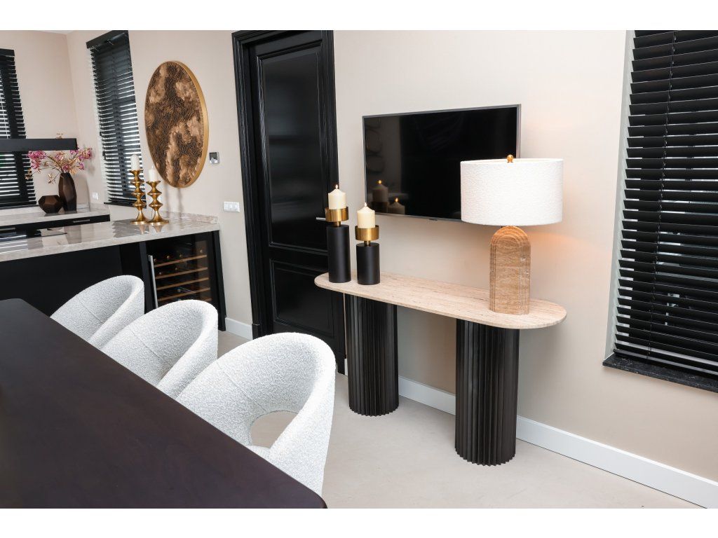Konzolový stolík Hampton je štýlový a praktický kus nábytku, ktorý sa perfektne hodí do vášho obytného priestoru. Stôl má krásnu travertínovú dosku podopretú čiernymi kovovými nohami. Vďaka elegantnému dizajnu a prepracovanej povrchovej úprave je vhodný do moderného aj klasického interiéru. Stôl poskytuje dostatok priestoru na vystavenie dekoratívnych doplnkov, fotografií, kníh a iných osobných vecí. Robustná konštrukcia a odolný materiál zabezpečujú, že konzolový stolík Hampton je praktickým a krásnym doplnkom vášho obytného priestoru. Dodajte svojmu interiéru nádych štýlu a funkčnosti s týmto krásnym konzolovým stolíkom Hampton.Dodatočné parametre