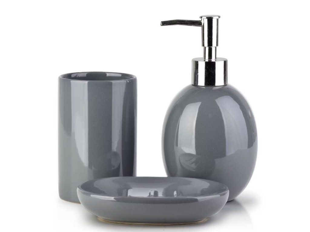 Set 3 ks zo šedej keramiky. Pozostáva z dávkovača mydla alebo mlieka, misky na mydlo a pohára na kefky. Rozmer dávkovača je 8 x 8 x 17 cm, pohár má rozmer 7 x 7 x 11 cm, miska 13 x 9 x 3 cm.Dodatočné parametre