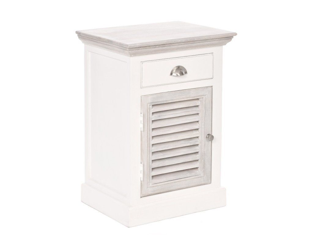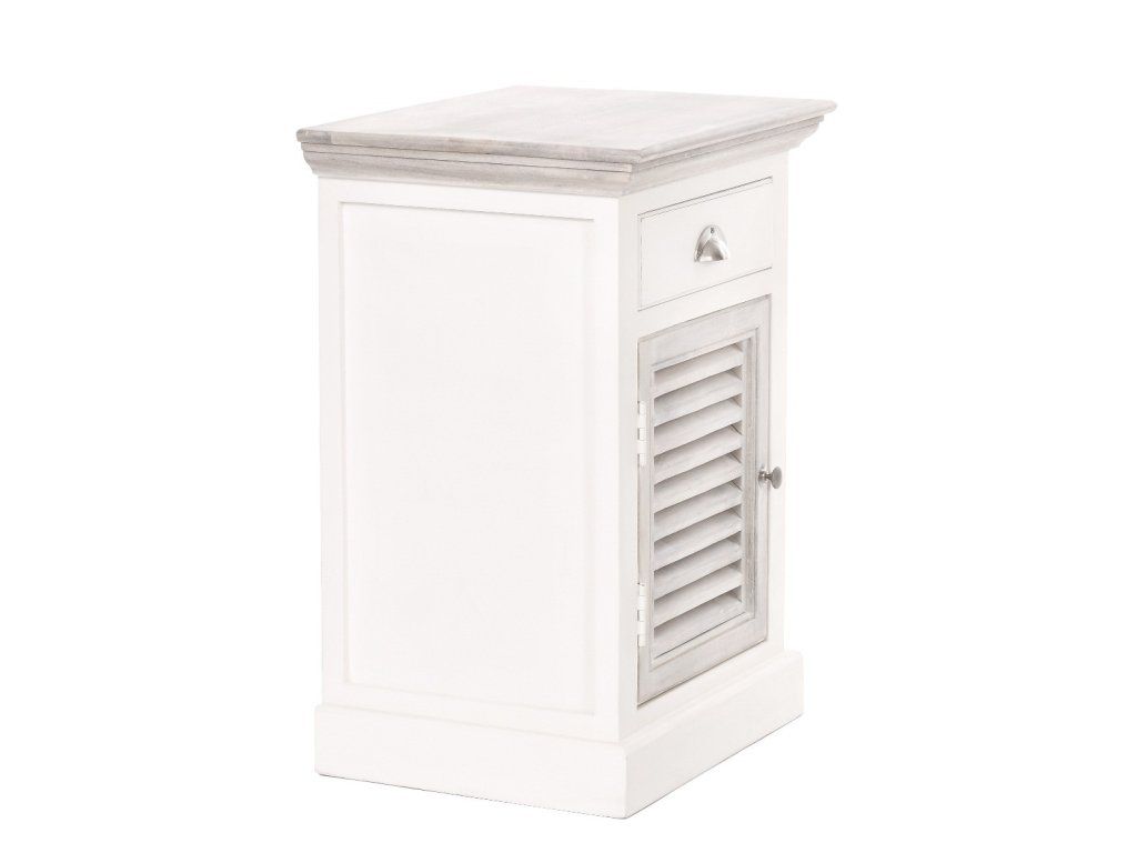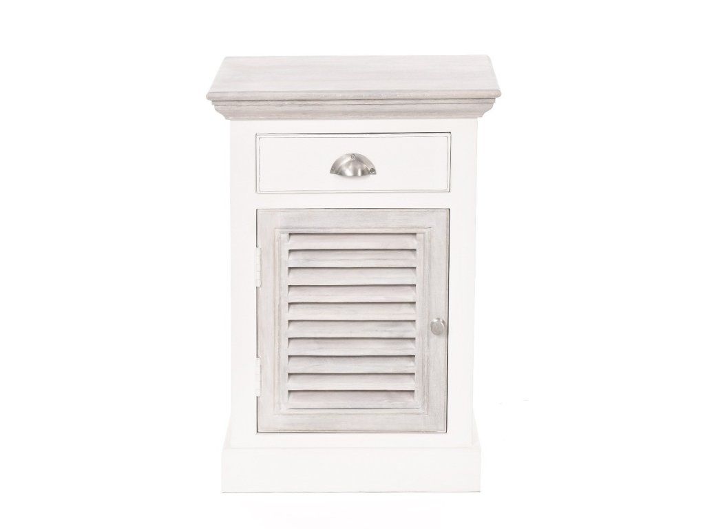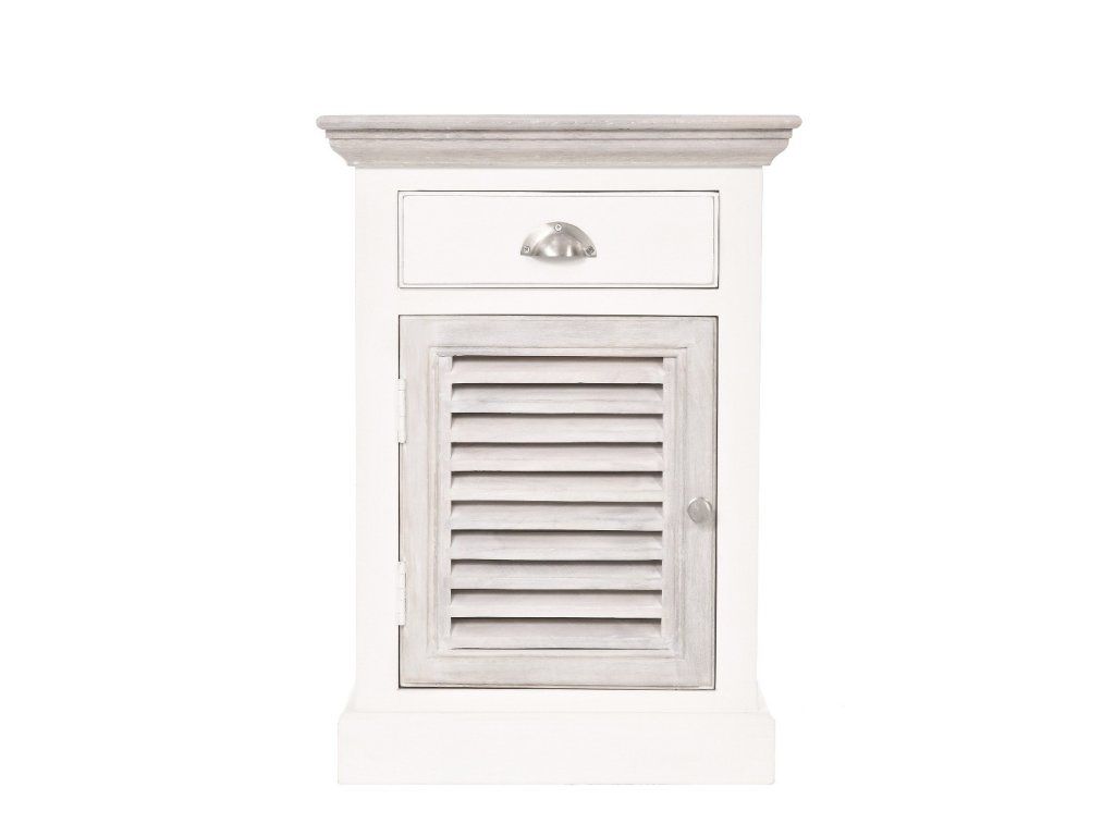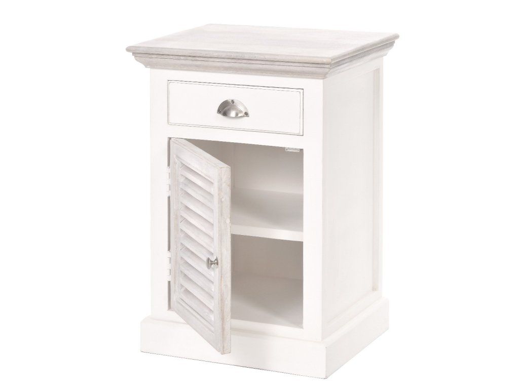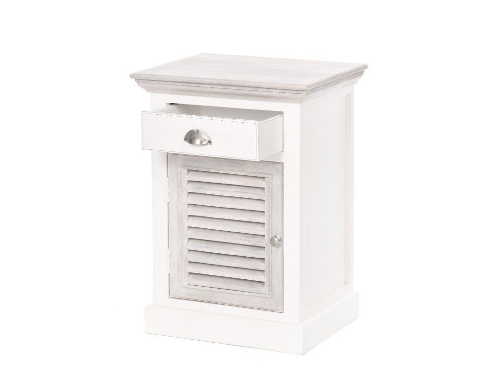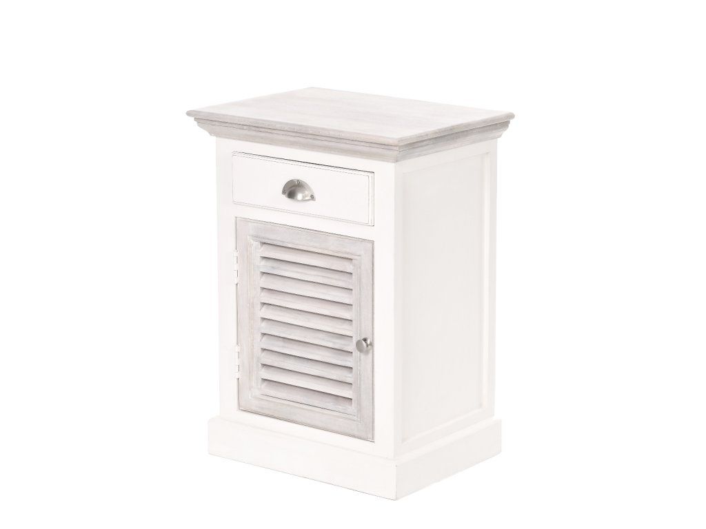 Ľavý nočný stolík East Hampton má rozmery 50x40 cm a výšku 70 cm. Tento krásny, jemne zdobený nočný stolík, vyrobený zo zmesi exotických drevín: akácie a manga, dokonale dopĺňa posteľ East Hampton. Prírodná farba dreva bola zachovaná na vrchnej časti a dvierkach, zatiaľ čo ostatné prvky sú biele. Skrinka nemá nohy; základňa spočíva priamo na podlahe. Skrinka má obdĺžnikovú vrchnú časť, zásuvku zdobenú striebornou rukoväťou a dvierka s množstvom ozdobných horizontálnych otvorov (okenice). Moderný dizajn skrinky umožňuje jej prispôsobenie kolekciám City a Grand Design. Naučte sa, ako sa správne starať o drevený nábytok - kliknite sem. Prímorské letovisko pre newyorskú elitu, ktoré sa nachádza na južnom pobreží Long Islandu. Hamptons nie je ničím iným ako atmosférou desiatok kilometrov piesočnatých pláží a nespočetných rezidencií, ktoré prekypujú triedou a eleganciou. Kolekcia Hamptons kombinuje prímorskú atmosféru s nádychom vznešenej elegancie. Kolekcia Hamptons, ktorá je krížencom newyorského štýlu a námornej dovolenkovej atmosféry, ponúka široký sortiment dreveného nábytku do interiéru. Vyrobené zo zmesi exotických drevín: akácie a manga, v bielej, sivej alebo mierne žltkastej prírodnej farbe. Akáciové drevo sa vyznačuje krásnou textúrou, farebným kontrastom a zdá sa, že mení farbu v závislosti od zdroja svetla. Toto prirodzene živicové drevo je mimoriadne odolné voči zmene farby spôsobenej vlhkosťou. Kolekcia Hamptons zahŕňa kuchynský a jedálenský nábytok vrátane jedálenských a konferenčných stolíkov, príborníkov, vitrín, komôd a radu venovanú spálni. Táto rada zahŕňa drevené postele, nočné stolíky, skrine a komody, ako aj pôvabné drevené hojdacie kreslo. Kolekciu Hamptons je možné kombinovať s radom ľanových pohoviek Nicea alebo Septon, ako aj s modernou kolekciou interiérového nábytku City. Perfektné sú aj textilné doplnky, ako napríklad prírodná bavlna, námornícka modrá, biela s nádychom jemnej žltej a červená z kolekcie Grand Design.Dodatočné parametre