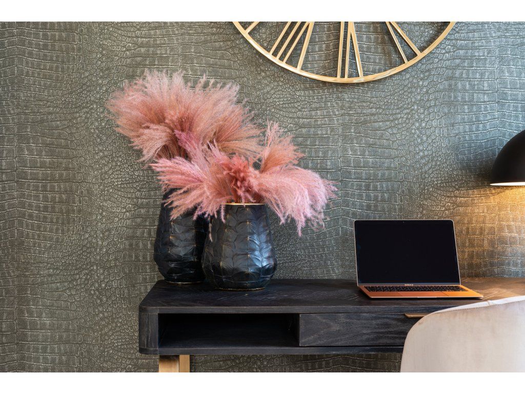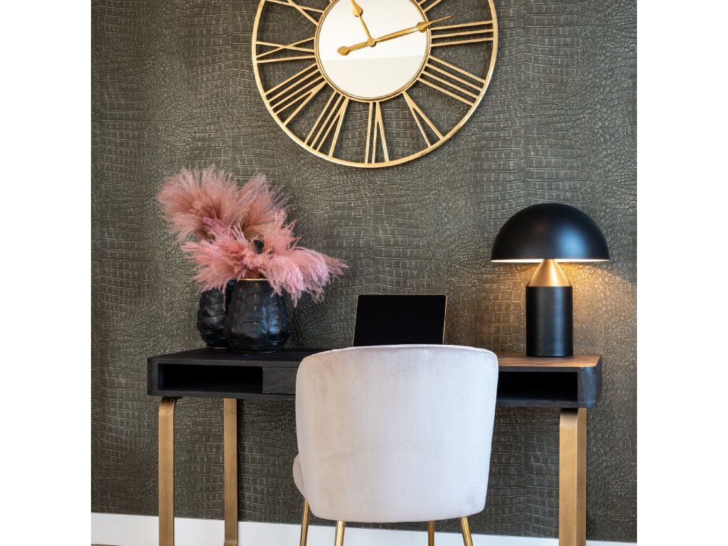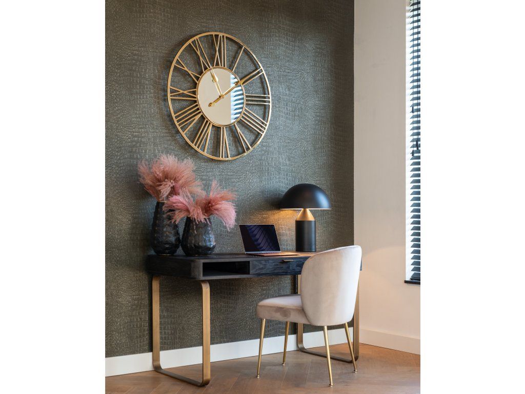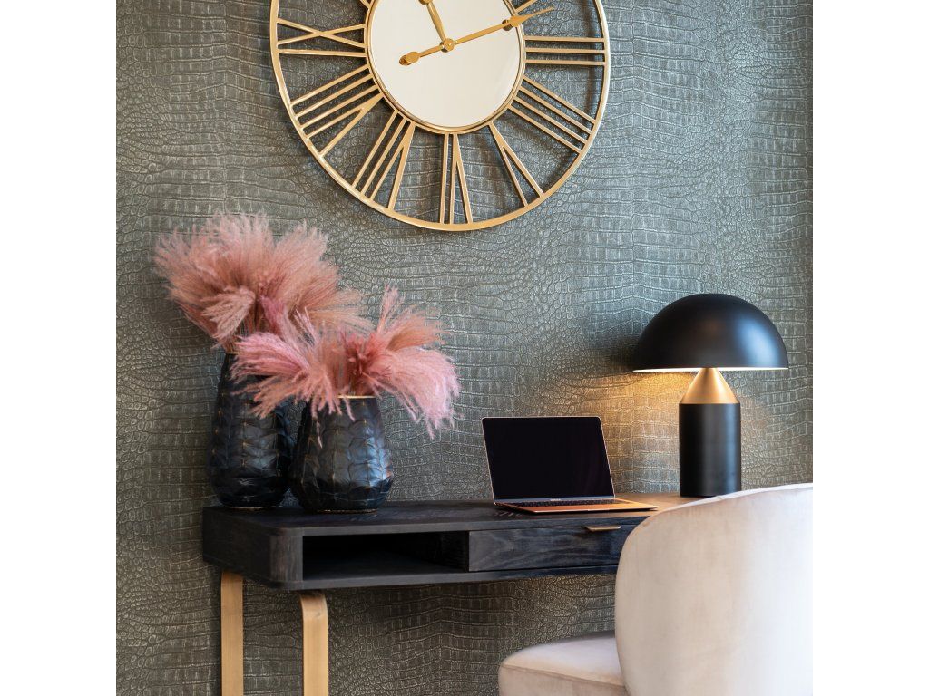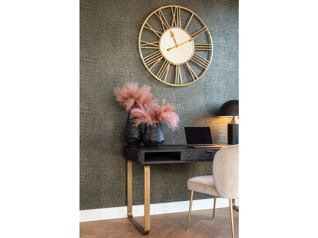 Písací stôl Blackbone Brass s 1 zásuvkou je elegantným vylepšením vašej kancelárie. Tento stôl je vyrobený z dubového dreva s kovovým rámom, má povrchovú úpravu z čiernej dubovej dyhy a mosadzných detailov a má jednu zásuvku na odkladanie vecí. Elegantný dizajn dodá vášmu pracovnému priestoru luxusný vzhľad.Dodatočné parametre