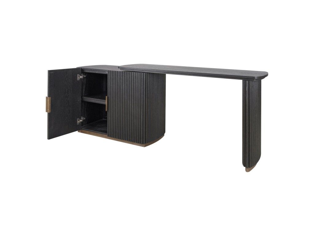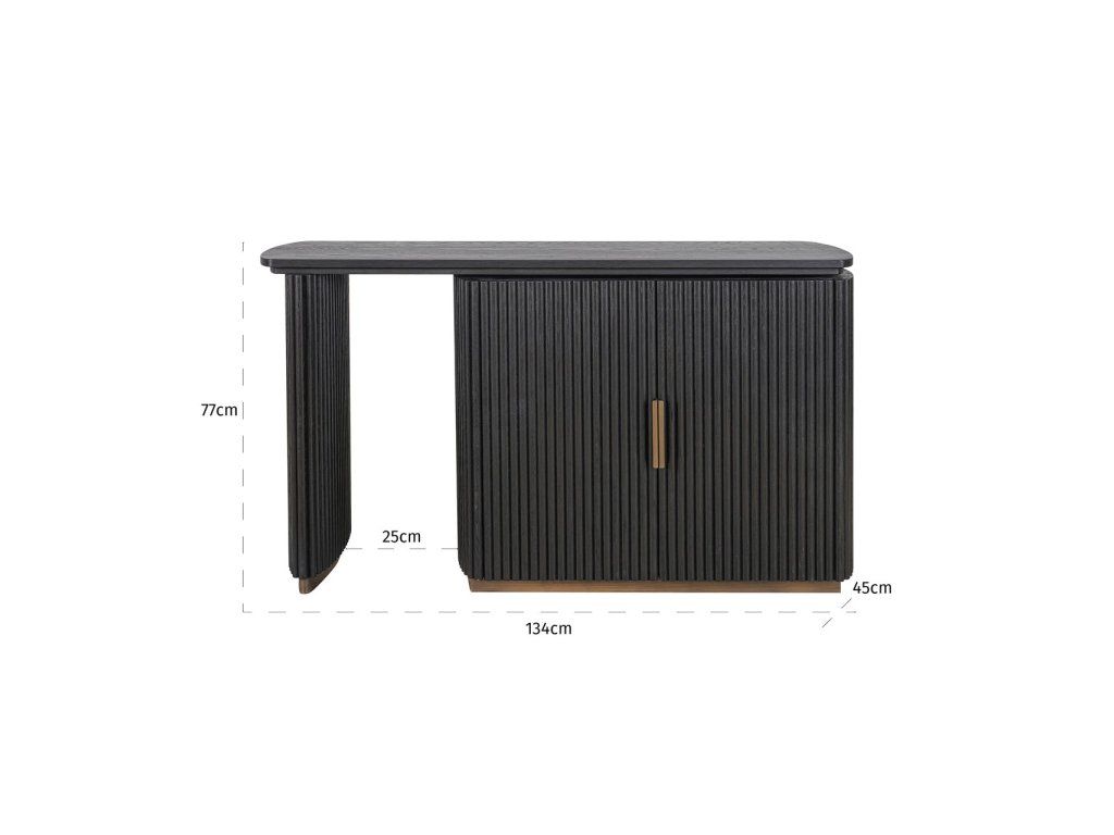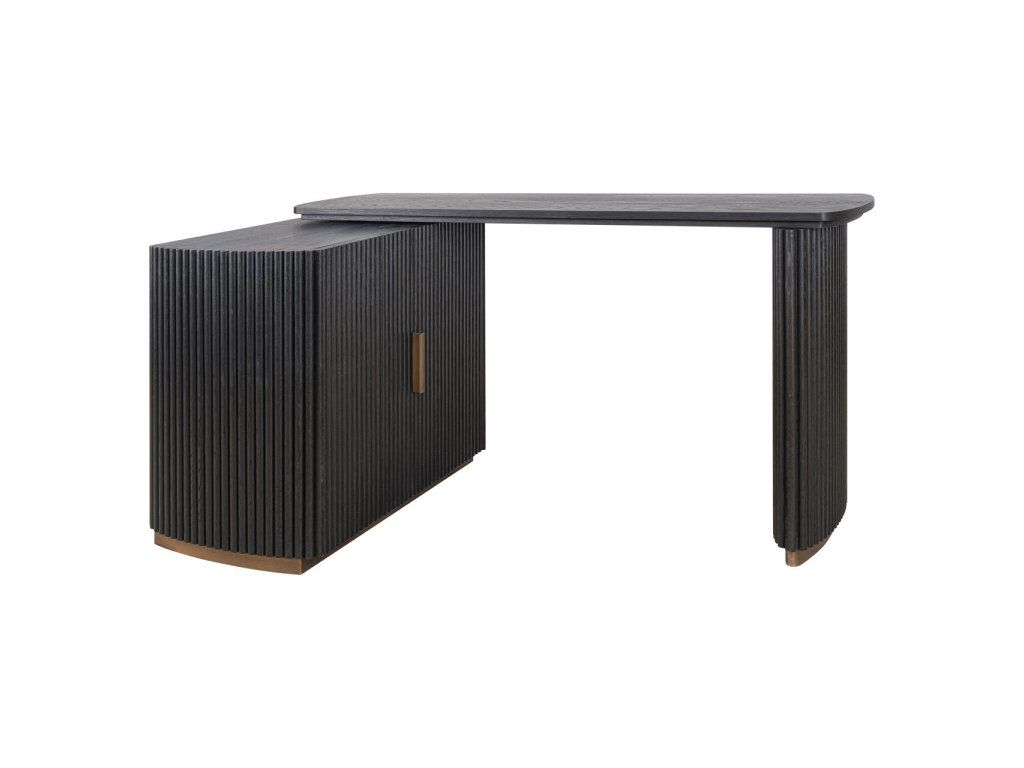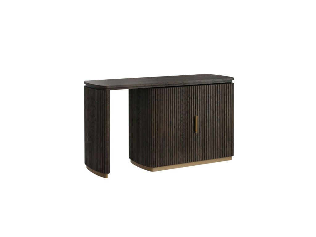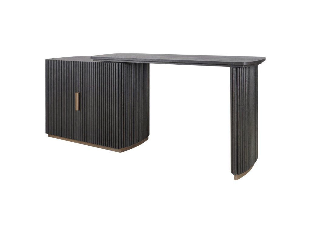 Stôl Cambon kombinuje funkčnosť s rafinovaným dizajnom. Je vyrobený z tmavého dreva s jemnou rebrovanou textúrou a ponúka za svojimi dvoma dvierkami dostatok úložného priestoru. Doska stola je tiež otočná, čo vám umožňuje ľahko prispôsobiť rozloženie vášmu pracovnému štýlu. Mosadzné akcenty dodávajú moderný nádych, zatiaľ čo zaoblené rohy vytvárajú elegantnú siluetu. Tento stôl sa perfektne hodí do klasického aj moderného interiéru a je štýlovým doplnkom vášho pracovného priestoru.Dodatočné parametre