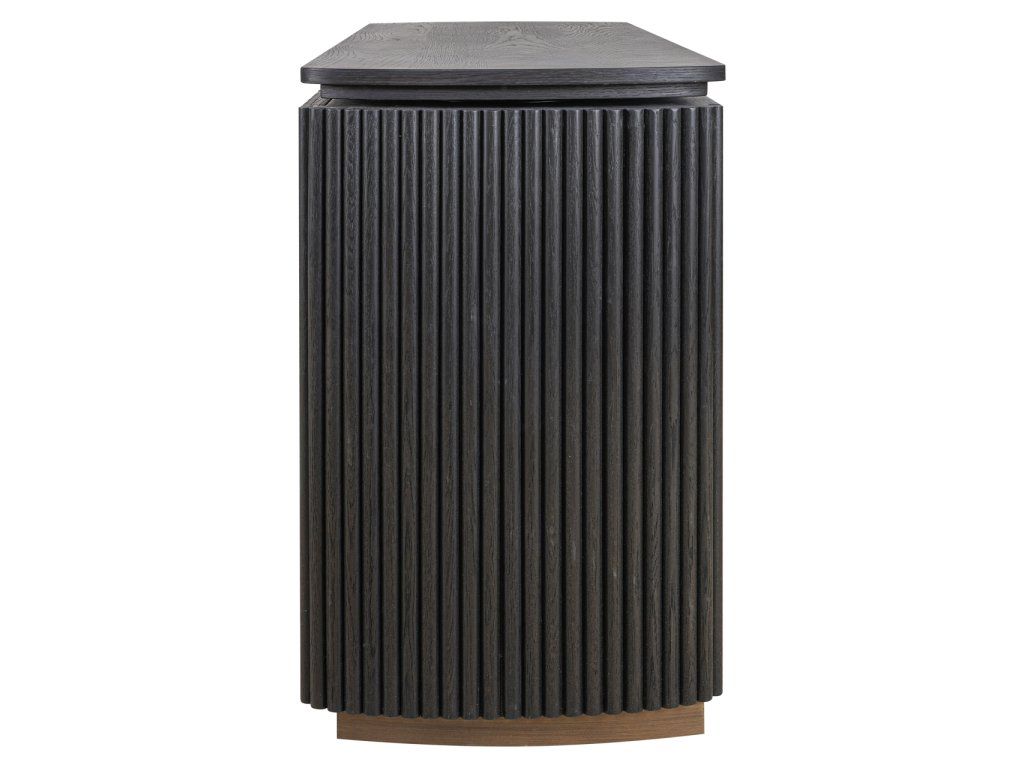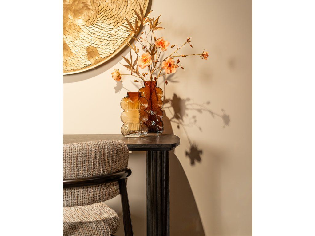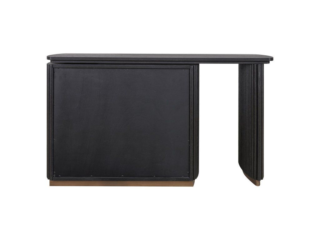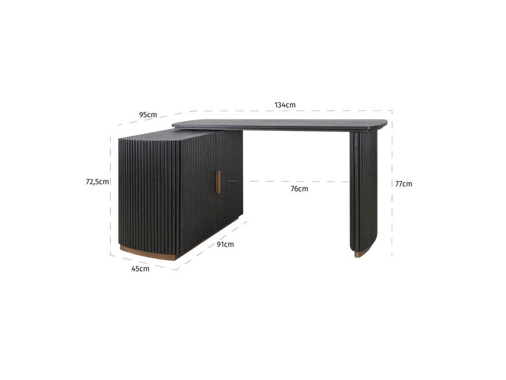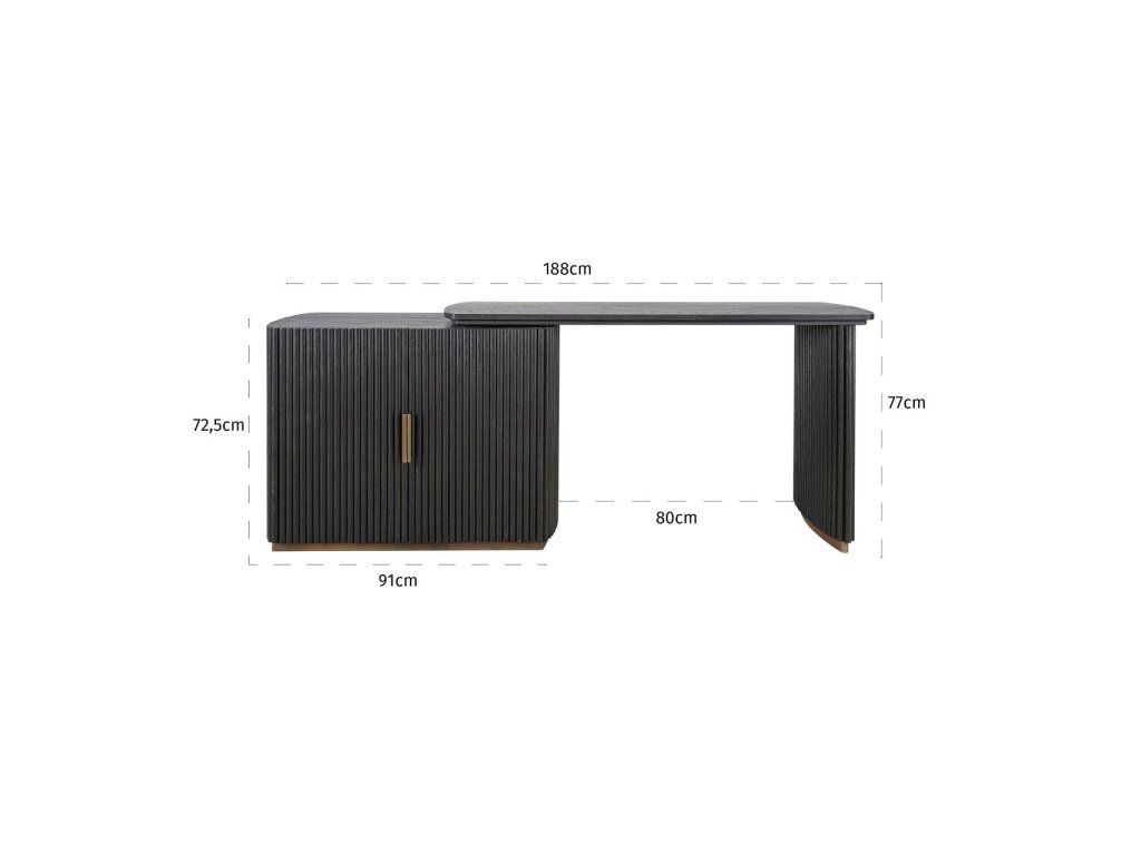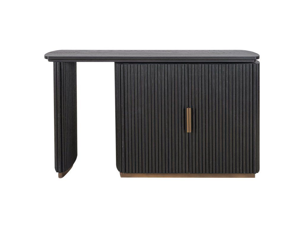 Stôl Cambon kombinuje funkčnosť s rafinovaným dizajnom. Je vyrobený z tmavého dreva s jemnou rebrovanou textúrou a ponúka za svojimi dvoma dvierkami dostatok úložného priestoru. Doska stola je tiež otočná, čo vám umožňuje ľahko prispôsobiť rozloženie vášmu pracovnému štýlu. Mosadzné akcenty dodávajú moderný nádych, zatiaľ čo zaoblené rohy vytvárajú elegantnú siluetu. Tento stôl sa perfektne hodí do klasického aj moderného interiéru a je štýlovým doplnkom vášho pracovného priestoru.Dodatočné parametre