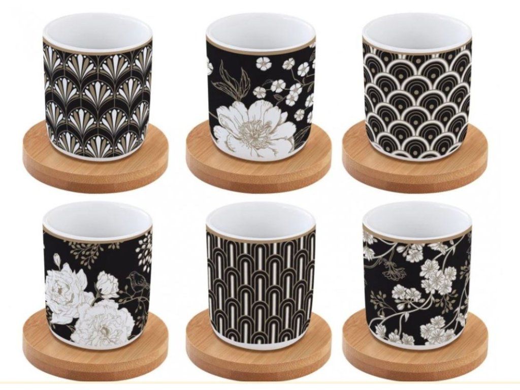 Elegantný set porcelánových šáločiek na espresso s bambusovými tanierikmi Vás očarí svojimi vzormi. Každý hrnček je jedinečný a zároveň ladiaci s ostatnými v sete. Je to vhodný darček pre milovníkov kávy, predáva sa v darčekovom balení. Hrnčeky sú bez uška a sú vhodné do umývačky riadu a mikrovlnnej rúry. Bambusovú podložku je nutné umývať len ručne. 100ml, darčekové balenie, čierno-biela potlačDodatočné parametre