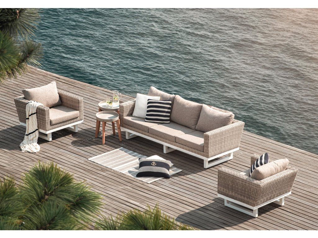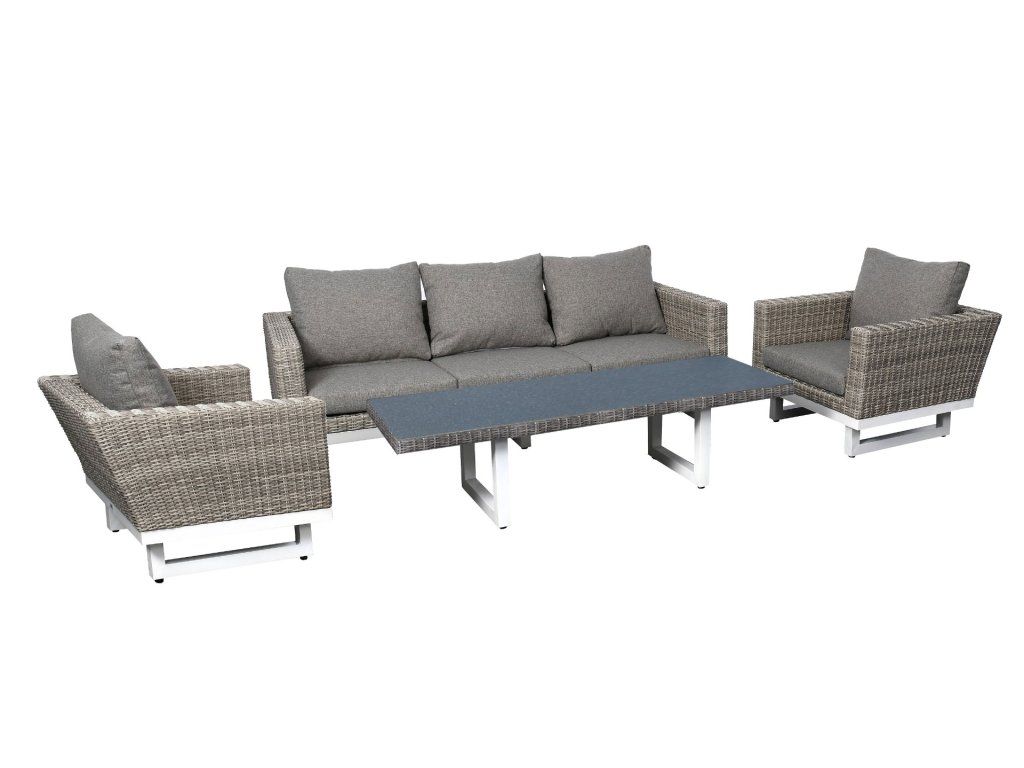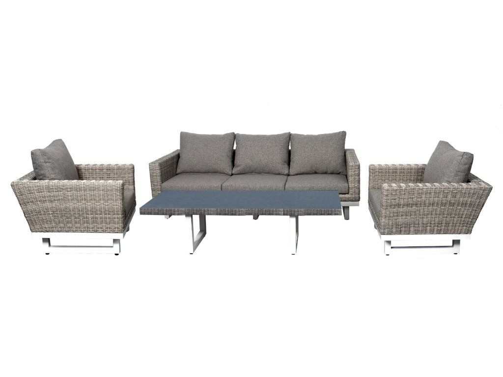Elegantná záhradná súprava ABA pozostávajúca zo štyroch kusov. Záhradná súprava ABA obsahuje dve záhradné kreslá s rozmermi 88x89x66cm, jednu trojmiestnu pohovku s rozmermi 225x89x55cm a konferenčný stolík s rozmermi 171x61x46cm. Aba sa vyznačuje jednoduchým geometrickým dizajnom na vysokých nohách, pohodlnými širokými sedadlami a vankúšmi. Nohy pohovky aj kresiel sú vyrobené z bieleho práškovo lakovaného hliníka. Hliník je odolný voči korózii a meniacim sa poveternostným podmienkam, ako je slnečné svetlo a dážď. Ostatné nábytkové prvky sú vyrobené z pieskovo sfarbeného ekoratanu (technoratanu), ktorý je tiež trvácny a odolný voči vlhkosti a UV žiareniu. Mäkké sivé sedadlá a mäkké vankúše operadla sú vyrobené z polyesteru, vďaka čomu sa ľahko čistia. Okrem bielych hliníkových nôh má široký konferenčný stolík aj tvrdenú lakovanú sklenenú dosku, ktorá je rovnako odolná a dlhotrvajúca. Súprava Aba je ideálna do veľkých záhrad a na terasy a poskytuje roky radosti. Záhradná súprava Aba je stelesnením elegancie, čistých foriem a vynikajúcich materiálov. Technoratan: Tento syntetický materiál, vyrobený z vystuženého polyetylénového vlákna HPDE alebo polyuretánu s vysokou hustotou, je modelovaný podľa ratanu. Vyznačuje sa vysokou odolnosťou voči poveternostným podmienkam vrátane UV žiarenia. Je vodeodolný a flexibilný. Je odolný voči rastu machu a plesní. Ľahko sa čistí a udržiava. Stačí ho opláchnuť alebo umyť jemným čistiacim prostriedkom. Preto sa používa v záhradnom nábytku. Umelé vlákno je ručne tkané na kovovom ráme. Ručná výroba zaručuje, že záhradný nábytok z technoratanu je jedinečný a vysoko zušľachtený. Rôzne typy technorattanového opletenia sa líšia farbou, tvarom, povrchovou textúrou a kvalitou spracovania. Vlákna použité v záhradnom nábytku Miloo Home majú štruktúru veľmi podobnú prírodným vláknam. Prirodzený vzhľad technoratanu ho robí vhodným pre mnoho dizajnov a štýlov. Hliník: Je klasifikovaný ako ľahký kov. Jeho hustota je približne 2,7 g/cm3, vďaka čomu je takmer trikrát ľahší ako oceľ. Hliníkové zliatiny vďaka vhodnému tepelnému spracovaniu vykazujú niekoľkonásobne lepšie mechanické vlastnosti. Je to ideálny materiál pre vonkajší nábytok. Medzi jeho výhody patrí odolnosť a odolnosť voči korózii. Práškovo lakovaný hliník je odolný voči meniacim sa poveternostným podmienkam a oderu. (Práškový náter sa nanáša na hliníkovú konštrukciu elektrostatickým striekaním. Pre dosiahnutie maximálnej odolnosti a odolnosti práškového náteru sa materiál zahrieva na teplotu medzi 160 °C a 210 °C.) Pri nízkych teplotách sa hliník stáva ešte odolnejším. Voda ho nehrdzavie. Nevyžaduje si údržbu ani neustálu starostlivosť. Tieto ľahké konštrukcie preto nevyžadujú veľkú silu pri premiestňovaní z jedného miesta v záhrade na druhé. Napriek svojej ľahkosti sú stabilné a odolné. Vydržia mnoho rokov používania v interiéri aj exteriéri. Polyester: Toto syntetické vlákno. Jeho technické vlastnosti z neho robia materiál modernej generácie, ktorý stanovuje nové štandardy flexibility a odolnosti. Jeho použitie umožňuje dosiahnuť vlastnosti, ktoré záhradkári vyhľadávajú: Vysoká pevnosť v ťahu – za sucha aj za mokra. Vysoká elasticita – nekrčí sa. Rýchlo schne – pretože neabsorbuje vodu. Odolný voči slnečnému žiareniu. Nenapadajú ho moli, plesne ani baktérie. Nealergénny. Žiadna badateľná strata mechanických vlastností. Je to ľahký, ale zároveň vysoko odolný materiál. Všetky komponenty zahrnuté v súprave sú balené v jednej krabici. Objavte kolekciu Maje Aba:Dodatočné parametre