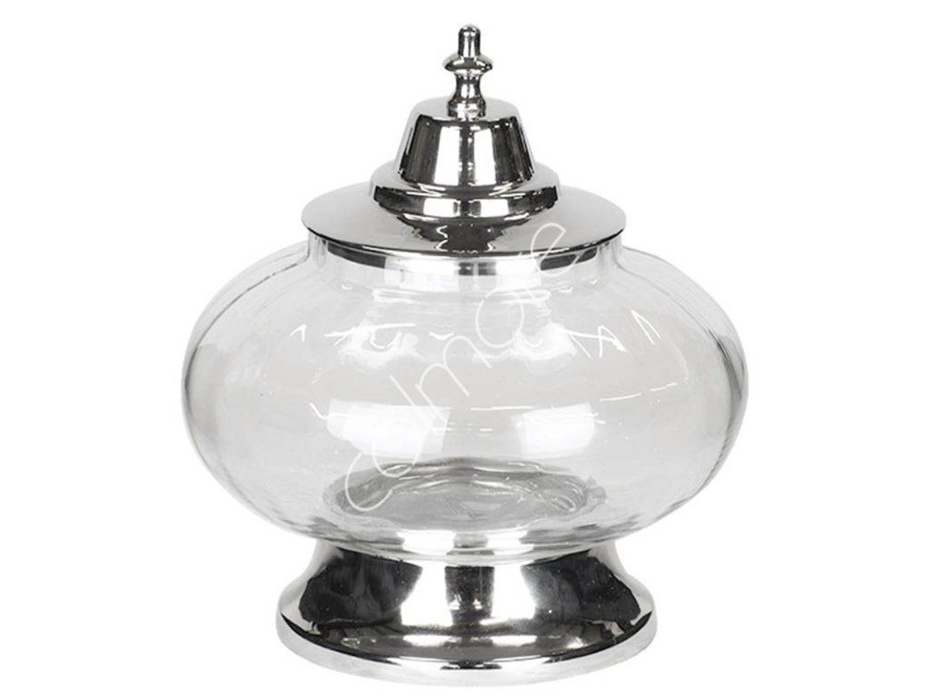 Dekoračná sklená nádoba na drobné pochutiny či sladkosti s kovovým uzáverom. Materiál: sklo, kov Rozmer: 14x14x15 cmDodatočné parametre
