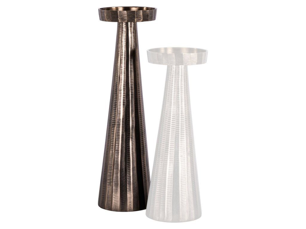 Tento svietnik má štíhly vertikálny tvar so stabilnou základňou. Bronzová povrchová úprava s jemným leskom vytvára teplý vzhľad. Jeho vyvážené proporcie a pokojný dizajn ho predurčujú na umiestnenie na stôl, príborník alebo konzolu.Dodatočné parametre