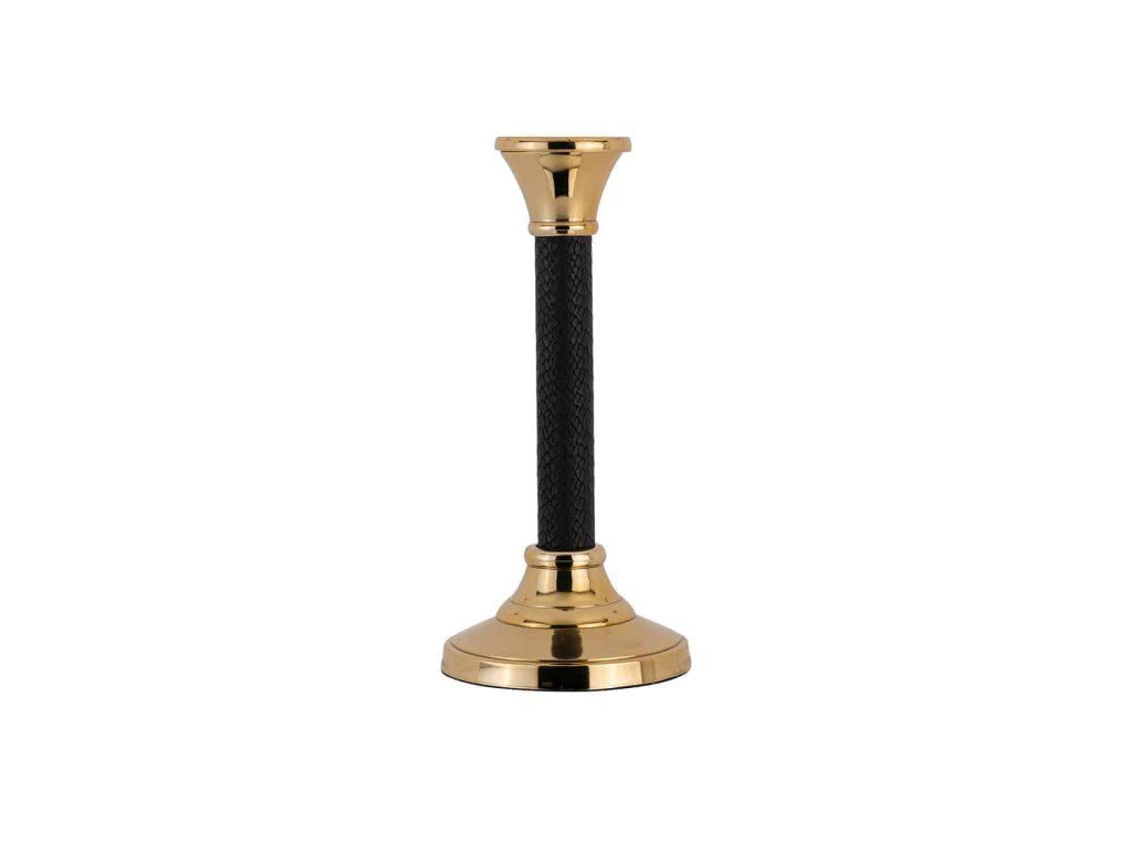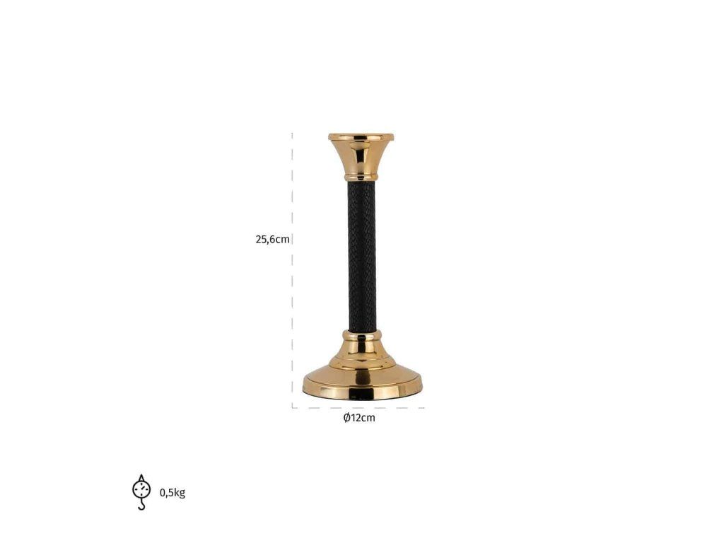 Kovový svietnik v zlatej farbe je ideálnym doplnkom na váš jedálenský stôl alebo komodu. Dodá Vášmu interiéru sviatočnú atmosféru. Skvelo sa hodí k iným zlatým doplnkom. Výška svietnika je 25,5 cm. Materiál: Hliník/Umelá čierna kožaDodatočné parametre