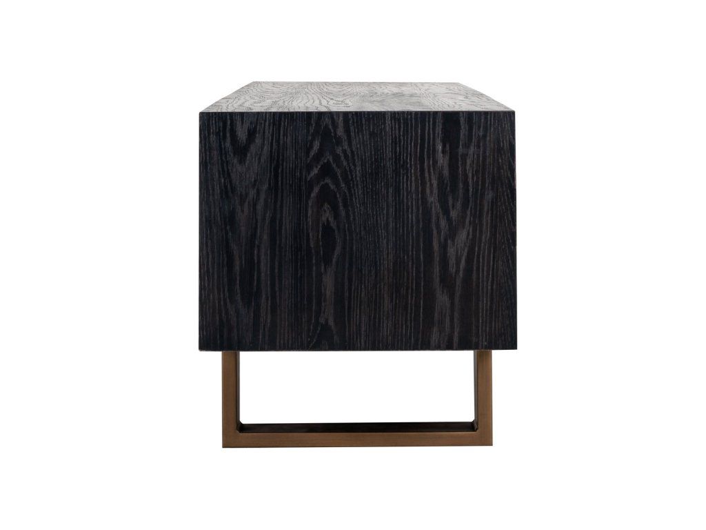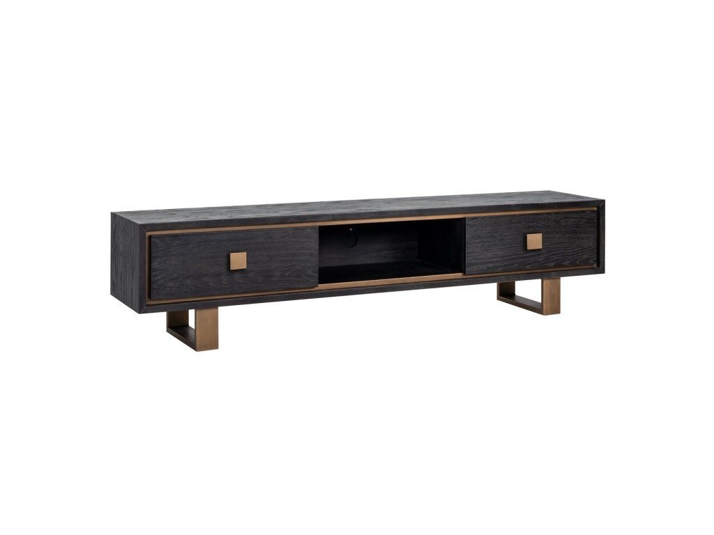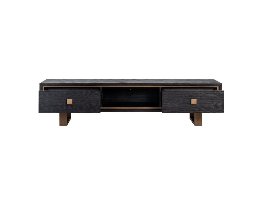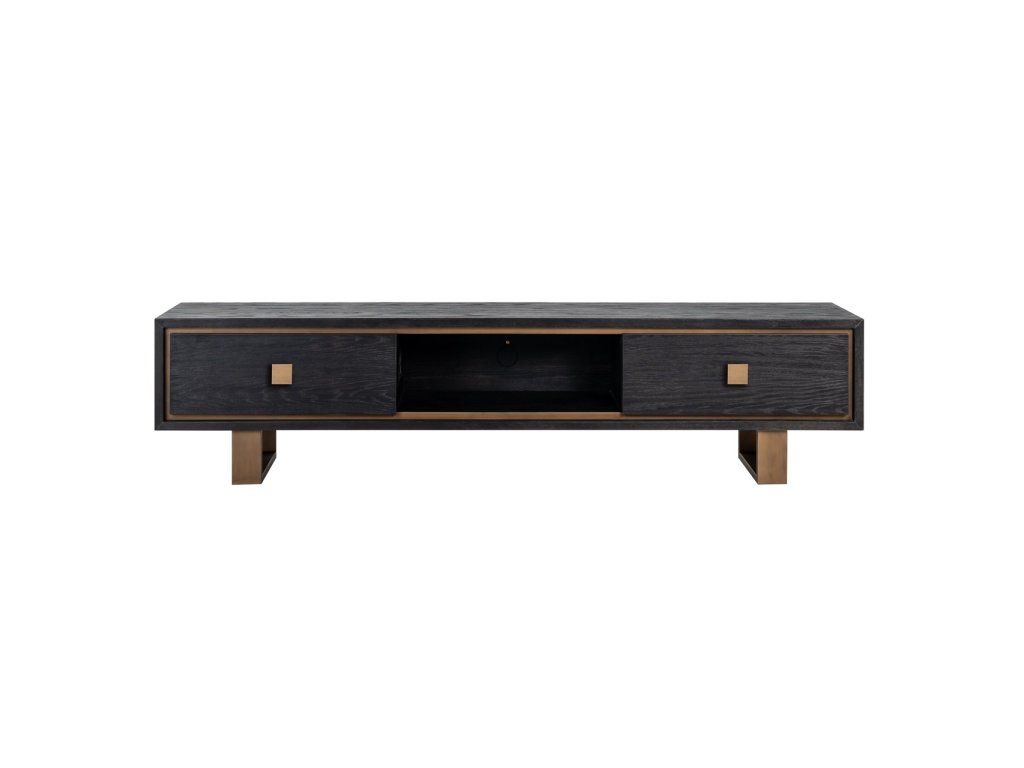 Rozžiarte svoj interiér s touto modernou TV komodou Hunter. Táto špeciálna príborník z čiernej dubovej dyhy s matným zlatom je dokonalým doplnkom vašej obývačky s dostatkom úložného priestoru v 2 zásuvkách.Dodatočné parametre