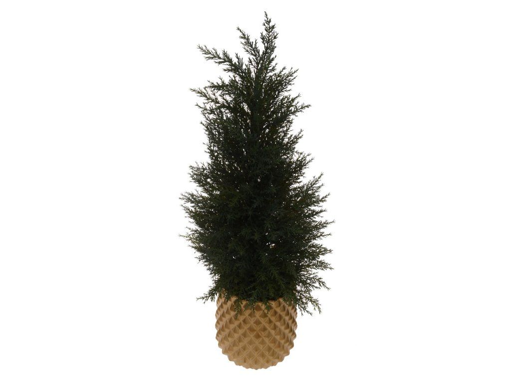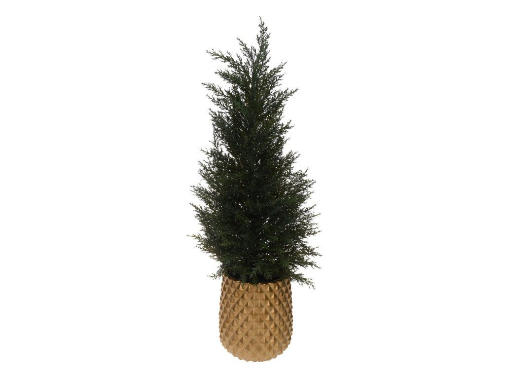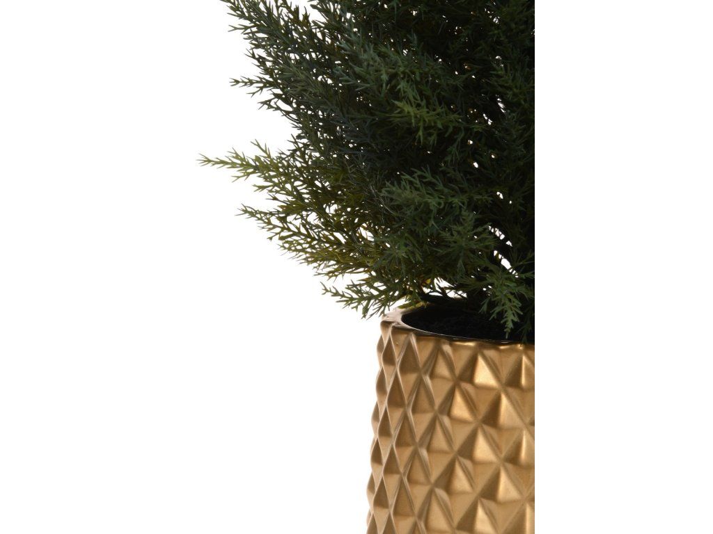 Stromček v kvetináči je zaujímavá, no zároveň tradičná vianočná dekorácia. Napodobňuje skutočný vianočný stromček, ale je odolnejší a trvácnejší, čo zaisťuje jeho krásny vzhľad počas celého vianočného obdobia. Je stabilný a pevný, takže sa skvele hodí do interiéru aj exteriéru záhrady. Stromček je umiestnený v elegantnom zlatom kvetináči a je ozdobený zeleným syntetickým ihličím. Konáre je možné ozdobiť podľa ľubovôle zavesením malých príveskov, sušeného ovocia alebo malých bublín.Dodatočné parametre