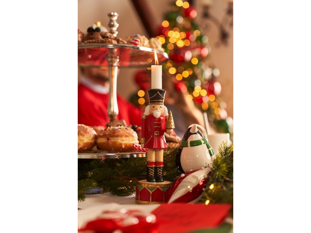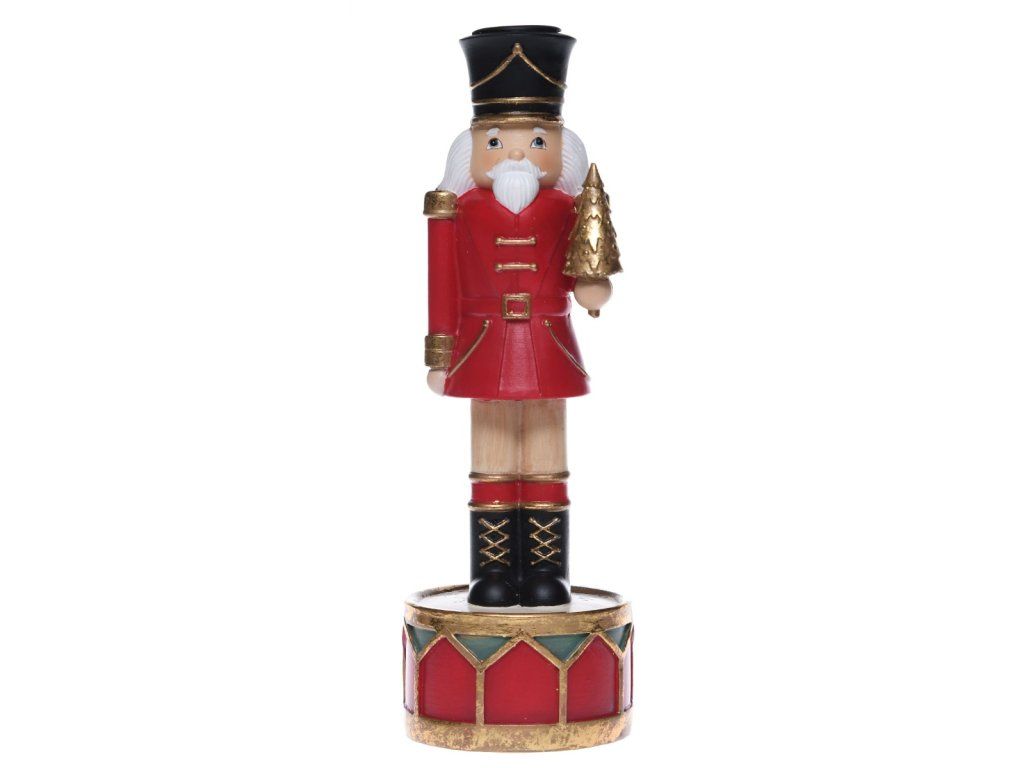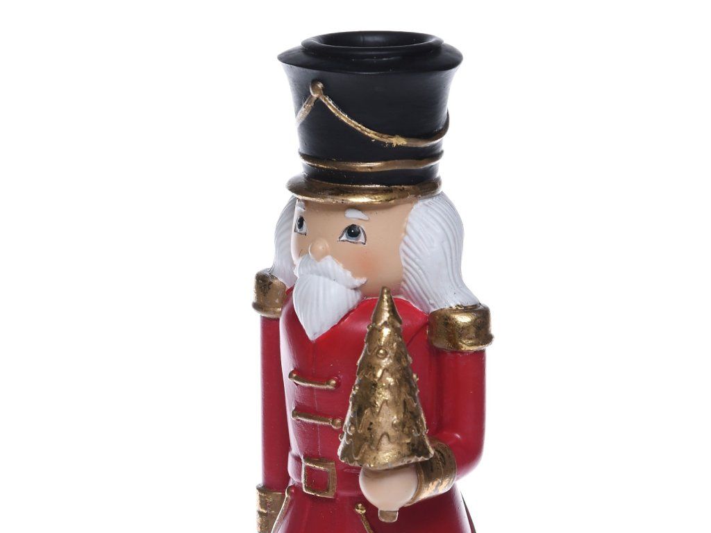 Svietnik v tvare vojaka – slávnostné sviatočné obdobie. Svietnik v tvare vojaka je skutočne jedinečný doplnok, ktorý umocňuje slávnostnú atmosféru a zároveň sa výrazne líši od tradičných svietnikov. Dopĺňa sviečky v rôznych farbách: zlatej, bielej a červenej. Ideálny na štedrovečerný stôl a ako pôvabný doplnok každého sviatočného obdobia. Svietnik v tvare vojaka je vyrobený zo skla. Zobrazuje vojaka na okrúhlom podstavci, precízne detailne prepracovaného, najmä v jeho oblečení. Svietnik dopĺňa štýlové figúrky z kolekcie. Farby: červená a zlatá. Výška: 24 cm.Dodatočné parametre