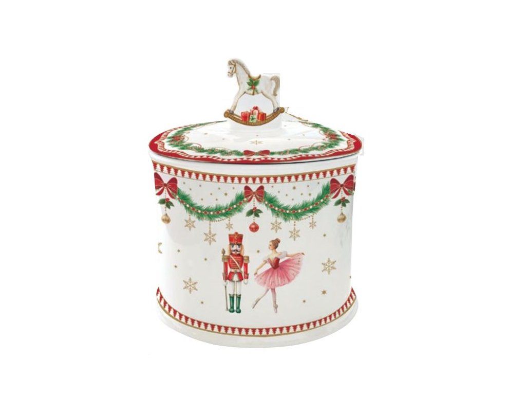 Vianočná dóza na sladkosti s krásnym motívom baleríny a luskáčika. Vhodný darček pre Vašich blízkych, balenie produktu je darčekové. Rozmer: priemer 14 x 16,5 cm Materiál: Porcelán Vhodné aj do umývačky riadu.Dodatočné parametre