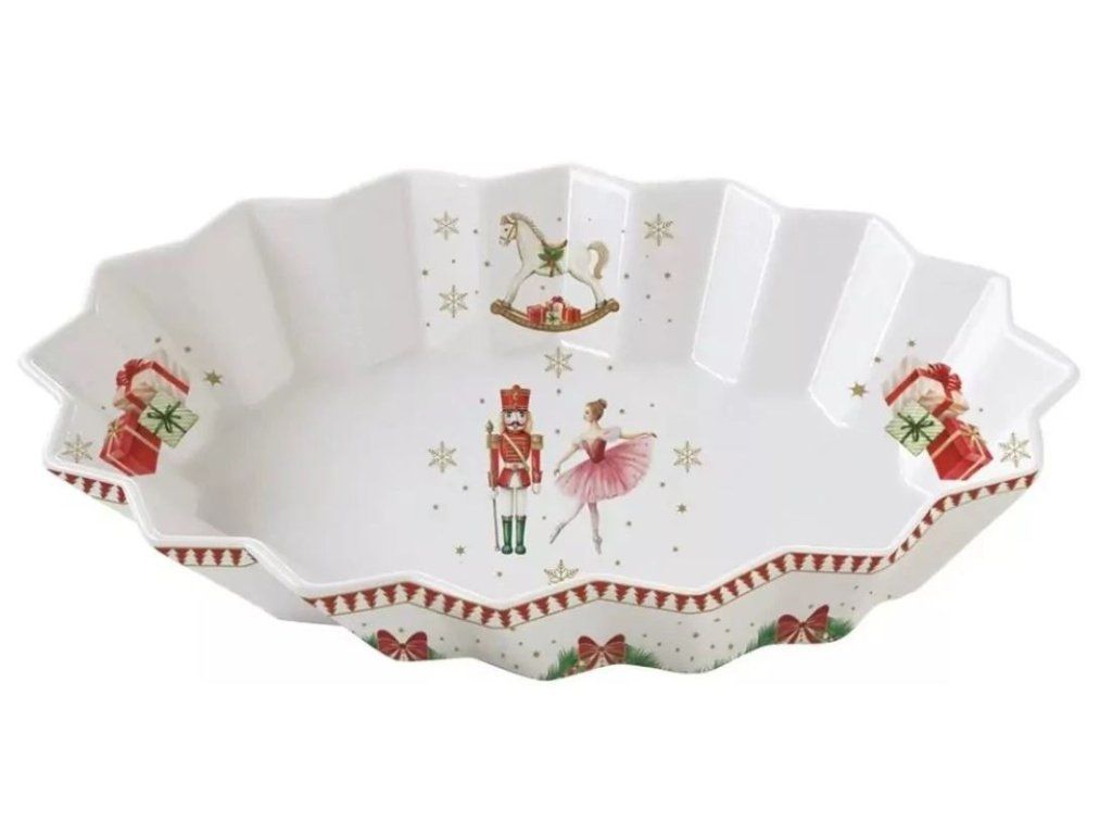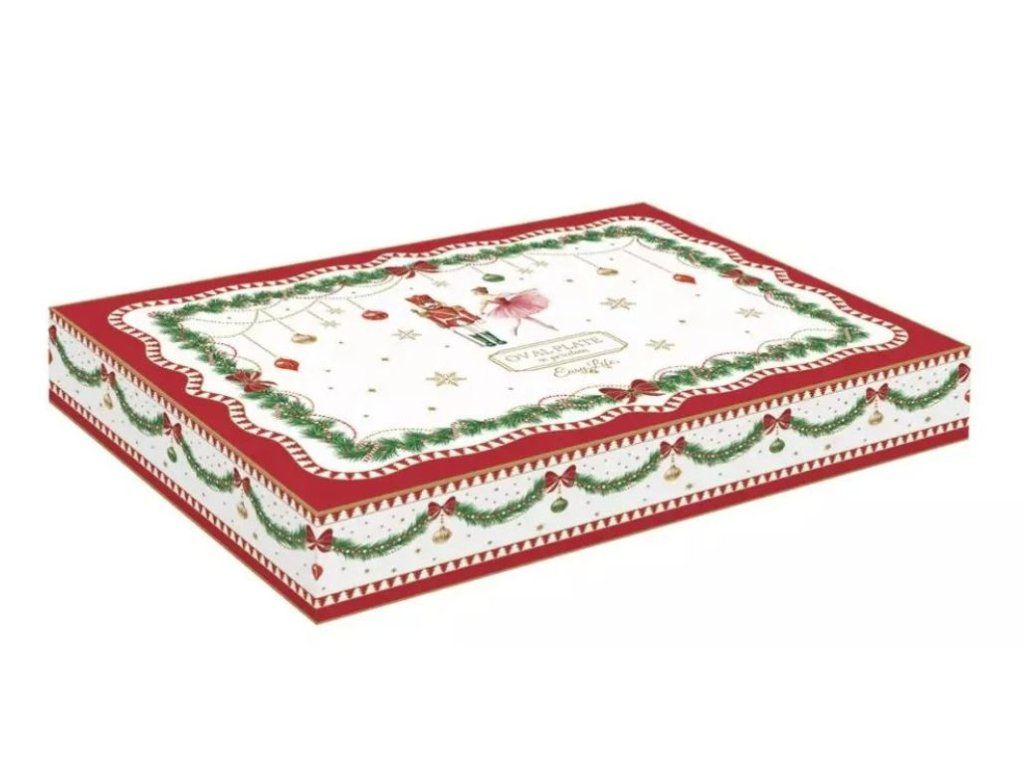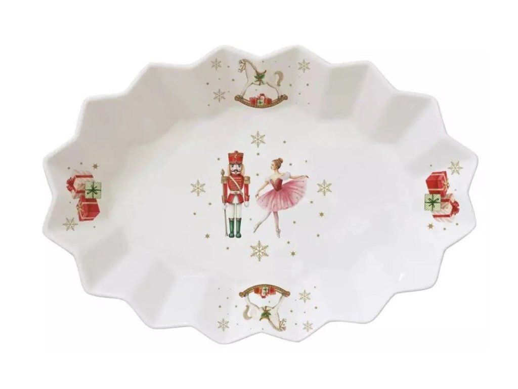 Porcelánová oválna misa s klasickým vianočným motívom baleríny a luskáčika. Je to nádherná ozdoba vianočného stola. Vhodný darček pre Vašich blízkych, balenie produktu je darčekové. Materiál: Porcelán Vhodné aj do umývačky riadu. Rozmer: priemer 25x17x4,5 cmDodatočné parametre