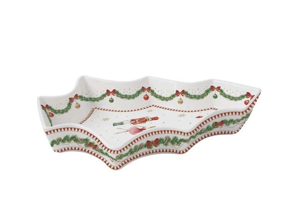 Porcelánová misa v tvare vianočného stromčeka s tradičným vianočným motívom baleríny a luskáčika. Je to nádherná ozdoba vianočného stola. Vhodný darček pre Vašich blízkych, balenie produktu je darčekové. Materiál: Porcelán Vhodné aj do umývačky riadu. Rozmer: 22x29 cmDodatočné parametre