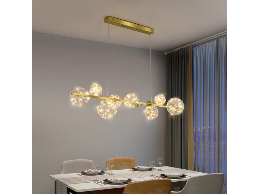Závesná lampa Melles – Výrazné osvetlenie do obývačky. Unikátna a originálna závesná lampa Melles 100x150 je skutočným kúskom interiéru. Je ideálna do obývačky, kancelárie, alebo dokonca do kaviarne či elegantného obchodu. Dopĺňa moderné a očarujúce interiéry a vytvára krásne svetelné efekty. Závesná lampa Melles 100x150 je vyrobená z kovu a skla. Stropná krytka a dlhé, rovné rameno sú vyrobené z kovu a rameno má osem guľových sklenených tienidiel. Zdrojom svetla je osem LED žiaroviek. Lampa je dostupná v zlatej a priehľadnej farbe. Rozmery: 100 x 150 cm.Dodatočné parametre