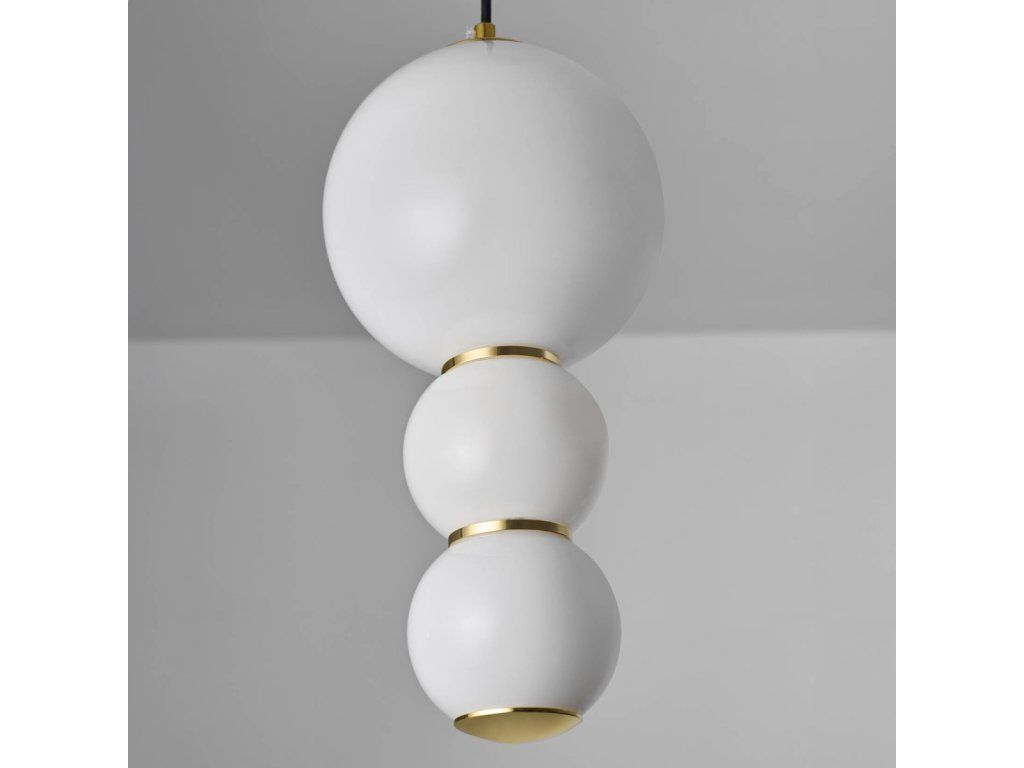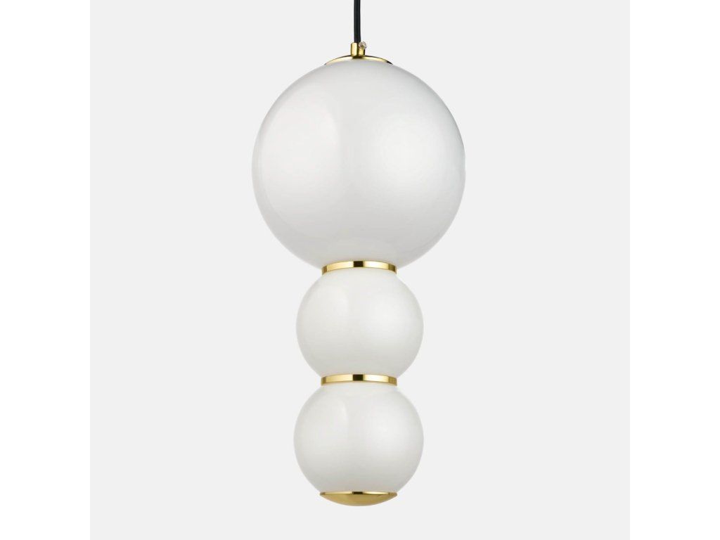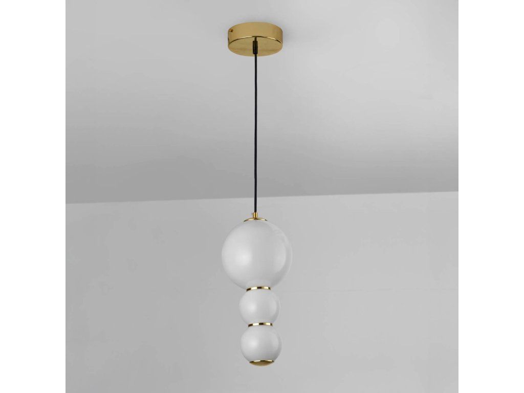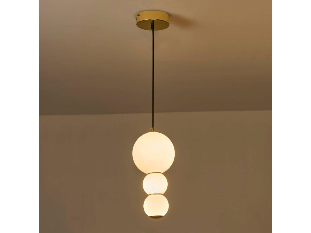 Závesná lampa Balls odráža filozofiu dizajnu Bauhaus a prostredníctvom svetelných gulí predstavuje eleganciu a sofistikovanosť. Svietidlo kombinuje minimalizmus, sofistikovanosť a modernosť. Je tiež pozoruhodne funkčné. Tri sklenené gule zavesené na čiernom kábli pripevnenom k zlatej stropnej rozete osvetľujú každý interiér – aj ten veľký. Mliečne biele tienidlá vrhajú príjemné, teplé svetlo, ktoré neoslňuje. Poskytuje pohodlie počas práce aj voľného času. Závesná lampa Balls je perfektným doplnkom do spálne, obývačky alebo jedálne. V týchto interiéroch môže slúžiť ako samostatný zdroj svetla alebo byť súčasťou väčšieho svietidla. Výhody produktu: Krásny a elegantný dizajn; Kombinácia vysoko kvalitných materiálov zaručuje dlhotrvajúce používanie; Vyrobené s dôrazom na detail; Vynikajúca voľba pre tých, ktorí si cenia originálny dizajn interiéru; Jednoduchá inštalácia; Lampa prináša útulnosť a teplo do každého interiéru. Detaily produktu: Materiál: sklo/kov; Farba: zlatá; Rozmery: 18x120 cm; Výrobca: Miloo HomeDodatočné parametre