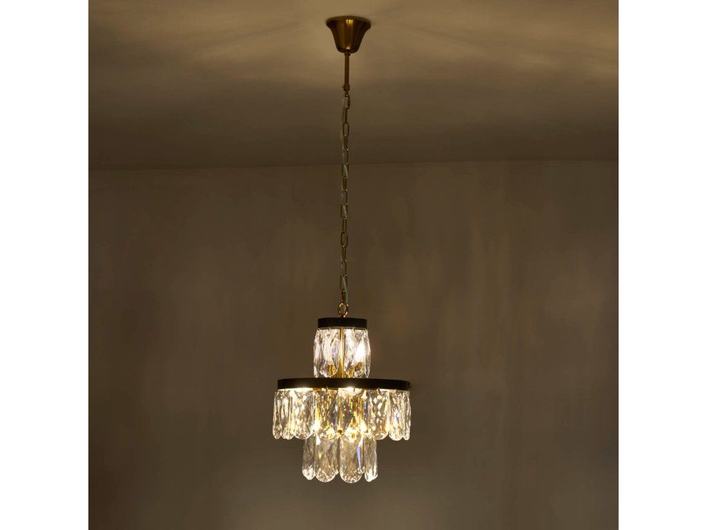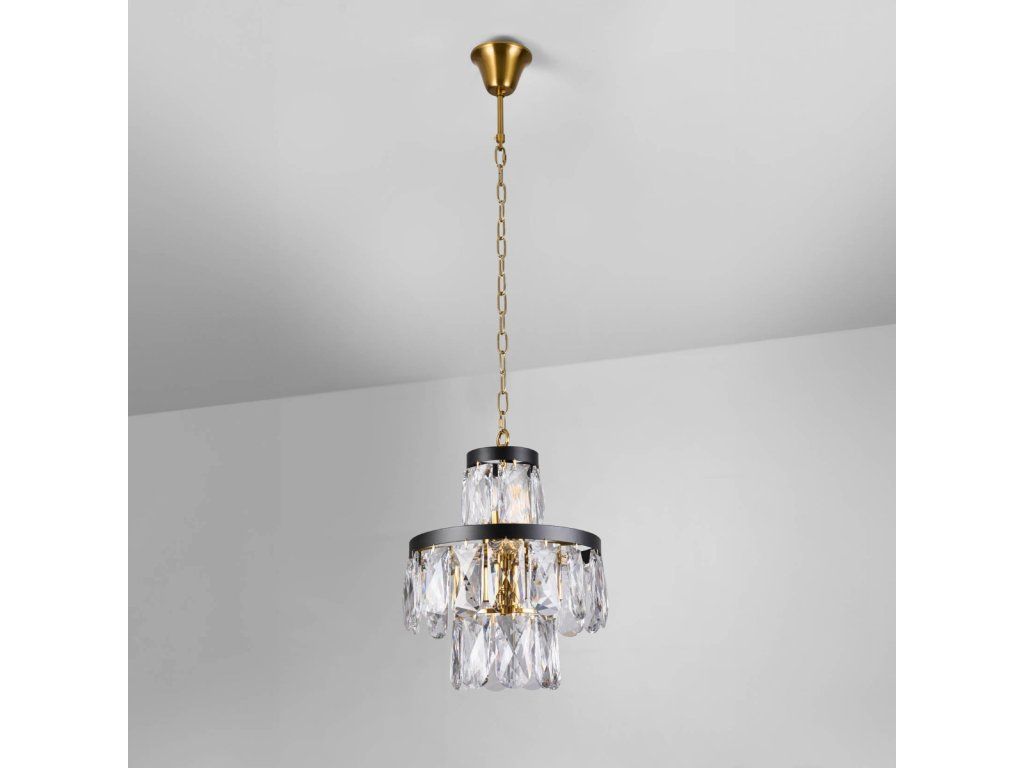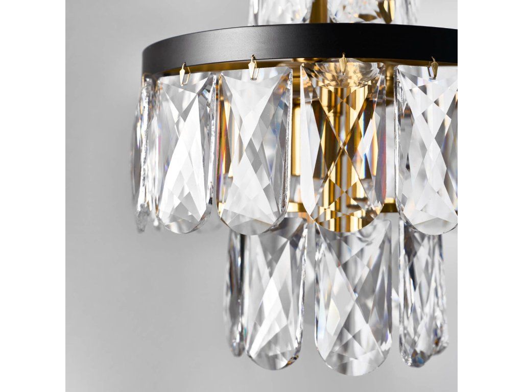 Závesná lampa Domes je moderný a jedinečný luster. Bude vynikajúcou voľbou do elegantných miestností, ako sú obývačky alebo jedálne. Lampa dokonale osvetlí a ozdobí ich interiér. Krištáľové panely zavesené na okrúhlom tienidle vytvárajú podmanivú kombináciu. Doplnkové krištáľové prvky krásne odrážajú svetlo a vytvárajú nezabudnuteľný svetelný efekt v interiéri. Je to aj vďaka tomu, že lampa je napájaná jedenástimi žiarovkami. Je určená na montáž na strop. Svietidlo je zavesené na ozdobnej retiazke a kábli. Výhody produktu: • Kovová konštrukcia • Až 11 svetelných zdrojov • Dokonale osvetľuje aj veľké interiéry • Vysoko dekoratívne • Vhodné do interiérov zariadených v štýle glamour, art deco, deco, modernej klasike • Elegantný dizajn • Nadčasové čierne a zlaté farby • Perfektná voľba do reprezentatívnych miestností (obývačka, jedáleň) • Jednoduchá inštalácia na kábel Detaily produktu Materiál: kov Farba: čierna/zlatá Rozmery: 36x40 cm Výrobca: Miloo HomeDodatočné parametre