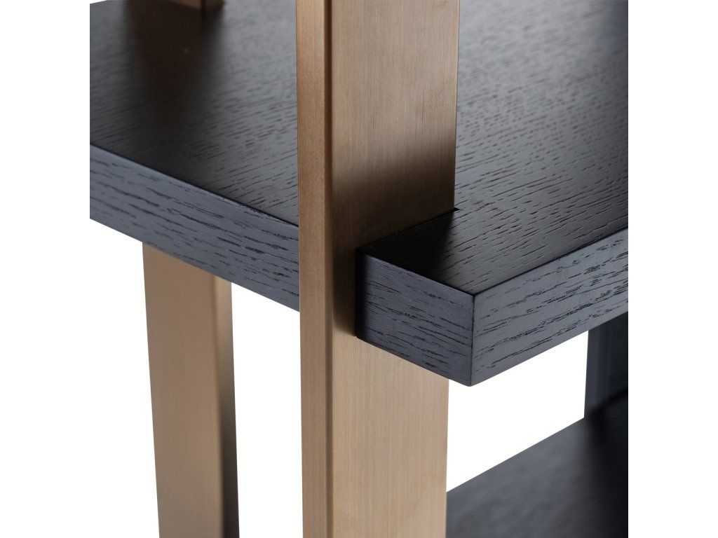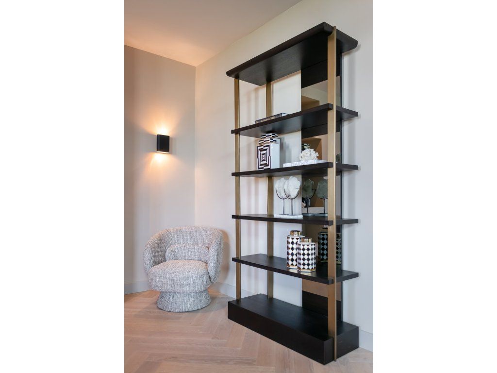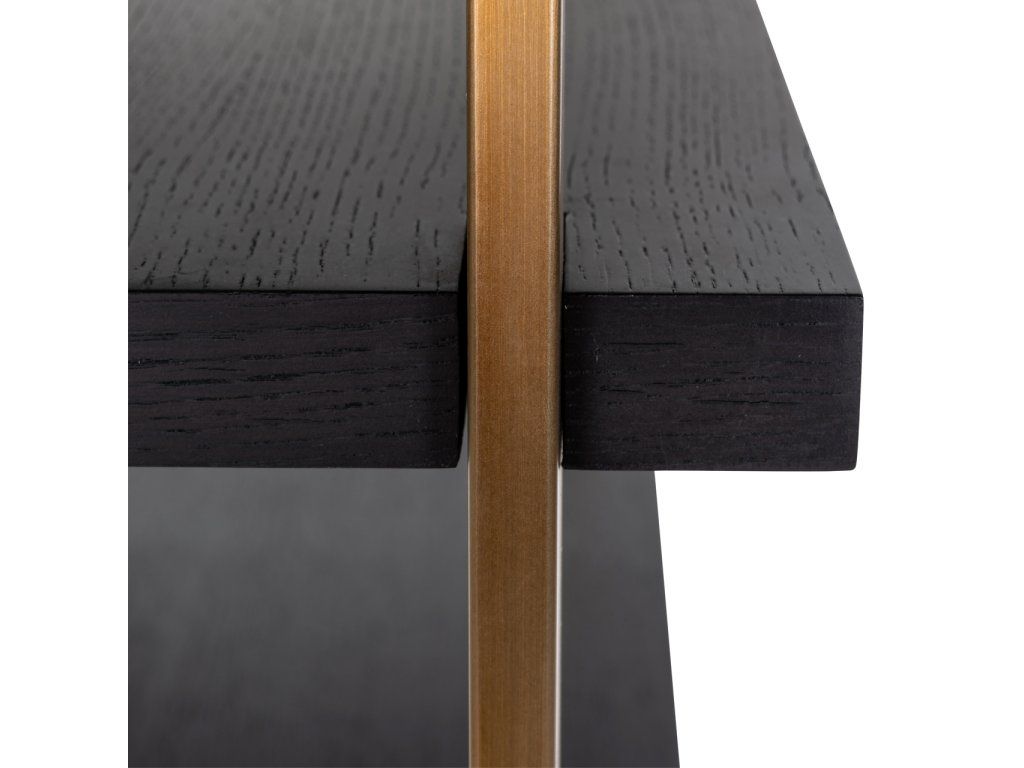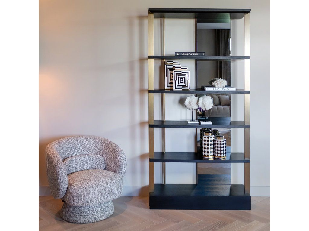 Nástenná skrinka Rigley so zrkadlom má elegantný a štýlový dizajn, ktorý sa dokonale hodí do vášho luxusného interiéru. Nástenná skrinka má povrchovú úpravu v brúsenom zlatom prevedení v kombinácii s dubovou dyhou vo farbe „uhľovo čierna“. Vďaka reflexnej zadnej strane nástenná skrinka žiari a má jedinečný charakter. Táto nástenná skrinka je vysoká 218 centimetrov, a preto je pútavá.Dodatočné parametre