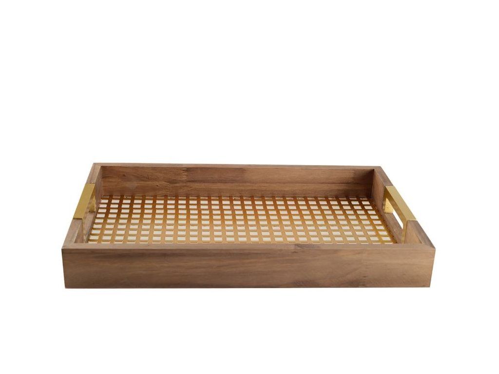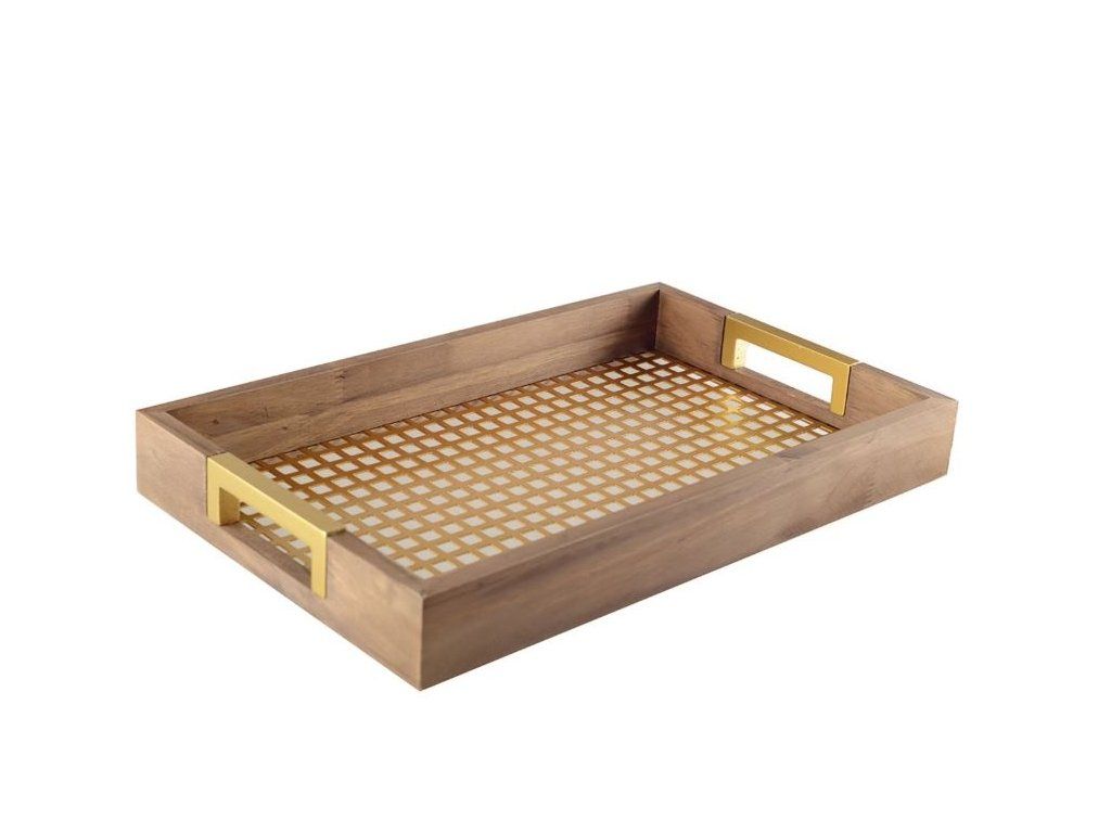 Elegantný podnos z exotického dreva kombinovaný s jemne zlatými rúčkami a spodnou časťou v podobe mriežky. Je to vhodná dekorácia Vášho stola alebo na odkladanie drobností na Vašom stole alebo na servírovanie dezertu. Rozmer: 40x28x5 cm Materiál: drevo, kovDodatočné parametre